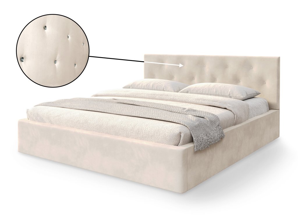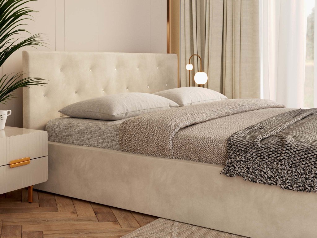 Az ágy háttámlája modern kristály gombokkal díszített.