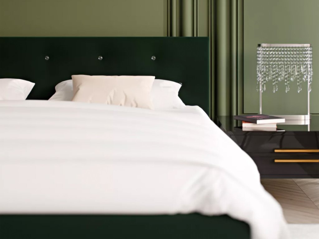 Az ágy háttámlája modern kristály gombokkal díszített.
