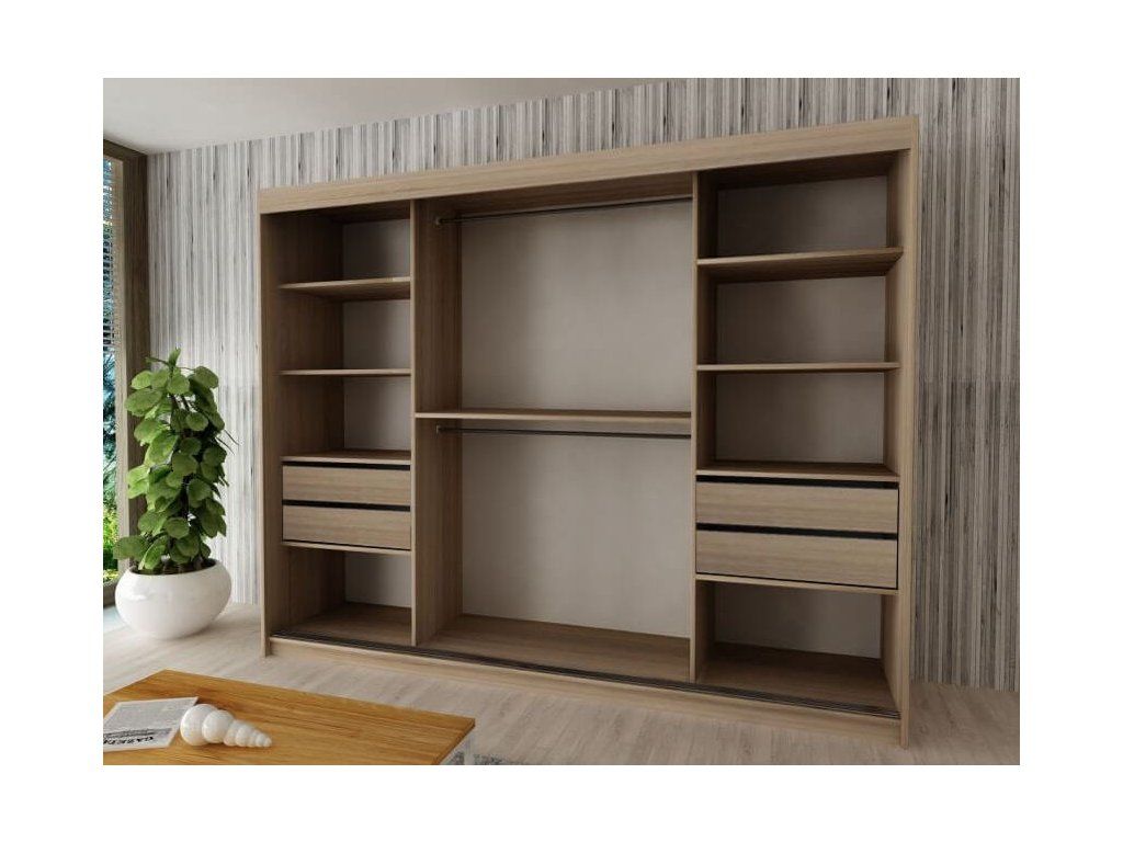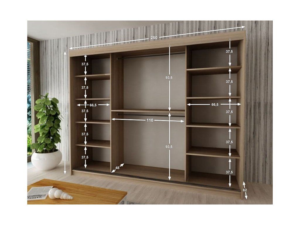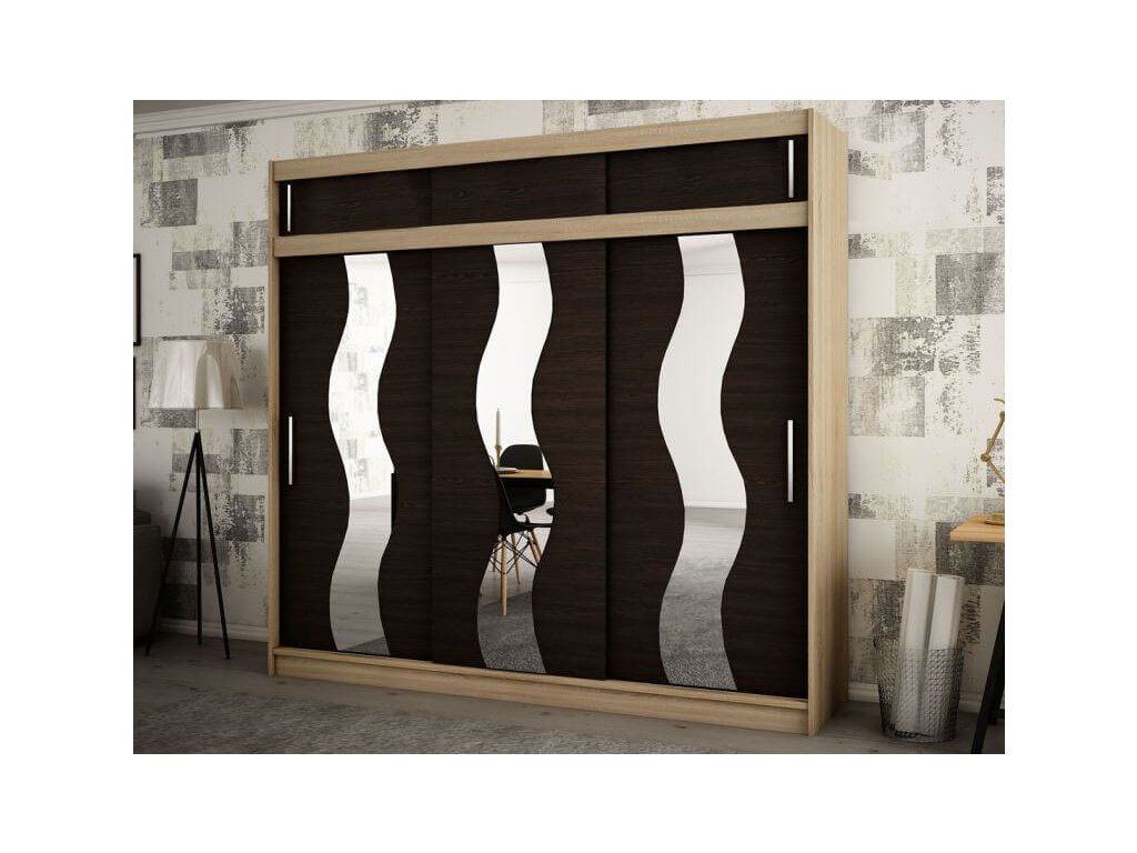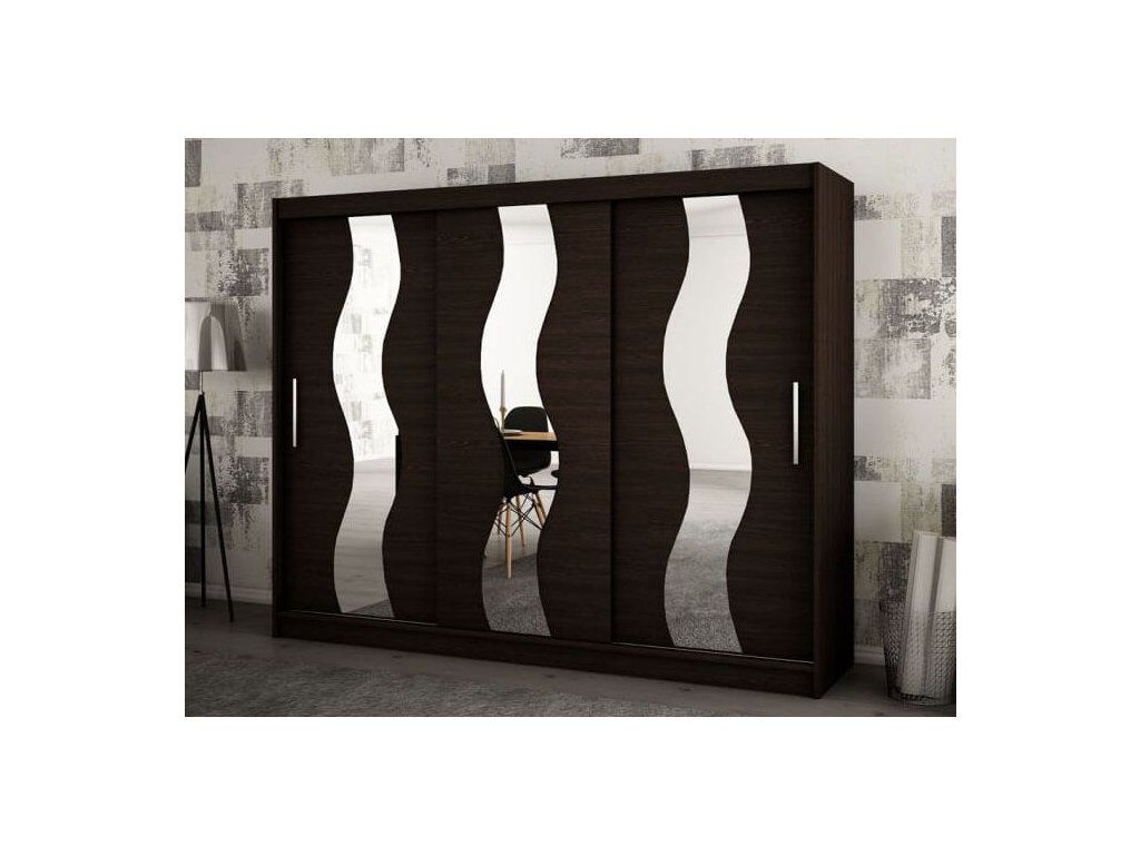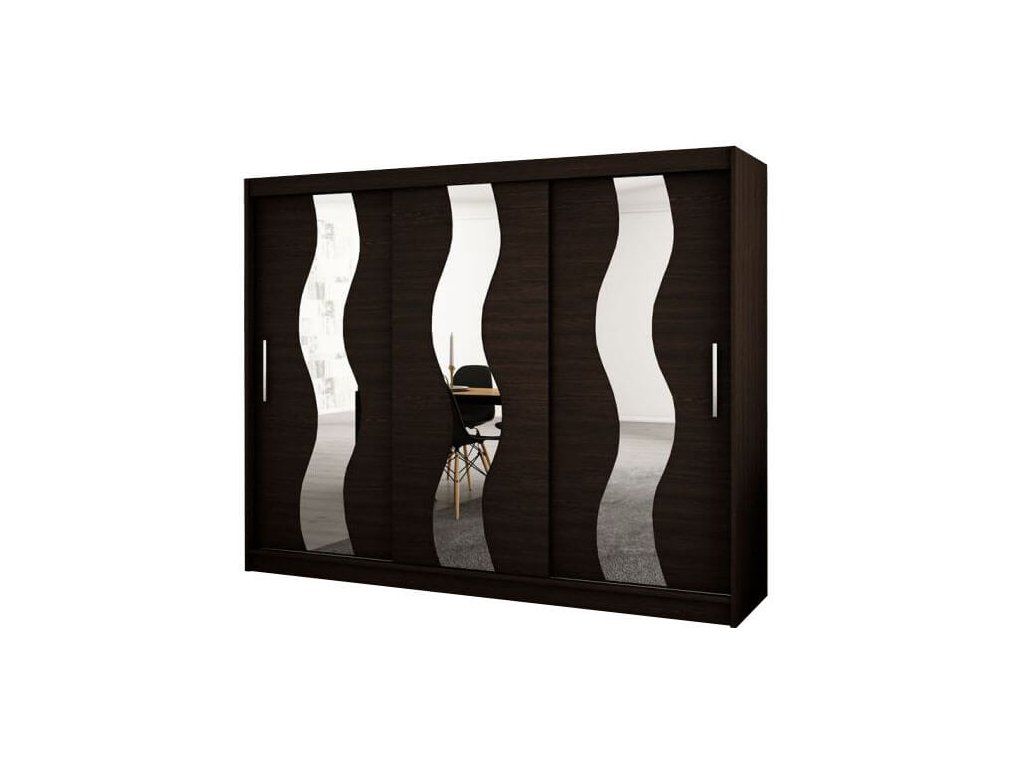 A hullámos tükörrel felszerelt MIREL 250 gardrób bőséges tárolóhellyel rendelkezik, hogy ruháit esztétikusan elrendezhesse. 16 mm vastag laminált DTD forgácslapból gyártott elragadó wenge színárnyalatban. A minőségi alapanyagoknak köszönhetően kiválóan ellenáll a mechanikai sérüléseknek, a magas hőmérsékletnek és páratartalomnak. A bútorlap élei PVC furnérral vannak lezárva. A polcos szekrény az ún. "BIMAK" tolóajtó rendszernek köszönhetően egyszerűen nyitható és zárható, fémsínen mozgatható. A gardrób belseje három részre osztható. Középen egy széles polc és két akasztórúd található. A szekrény jobb és bal oldalán pedig négy-négy polc került elhelyezésre, ezáltal öt tárolásra alkalmas rekesz segíti a ruhanemű rendszerezését mindkét oldalon. A MIREL 250 tükrös gardrób jól mutat minden modern hálószobában és előszobában.