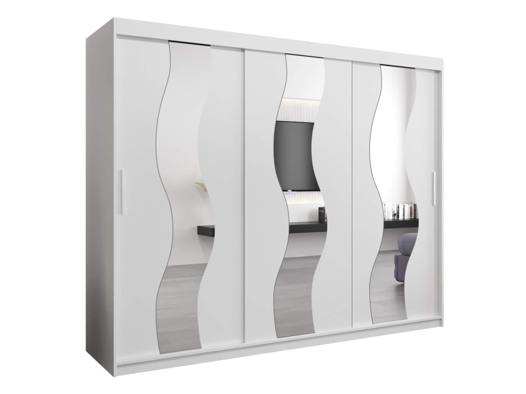 A MIREL 250 fehér színű tükrös gardróbszekrény minőségi 16 mm vastag laminált forgácslapból (DTD) gyártott bútor. Ennek köszönhetően ellenáll a mechanikai sérüléseknek, a magas páratartalomnak és hőmérsékletnek. A bútorlap élei PVC furnérral vannak lezárva. A polcos szekrény az ún. "BIMAK" tolóajtó rendszernek köszönhetően egyszerűen nyitható és zárható, fémsínen mozgatható. A gardrób belseje három részre osztható. Középen egy széles polc és két akasztórúd található. A szekrény jobb és bal oldalán pedig négy-négy polc került elhelyezésre, ezáltal öt tárolásra alkalmas rekesz segíti a ruhanemű rendszerezését mindkét oldalon. A MIREL 250 tükrös gardrób jól mutat minden modern hálószobában és előszobában.