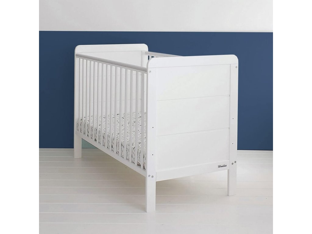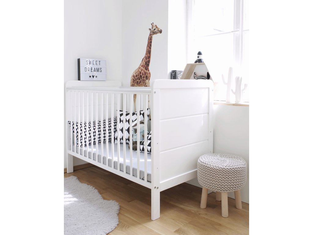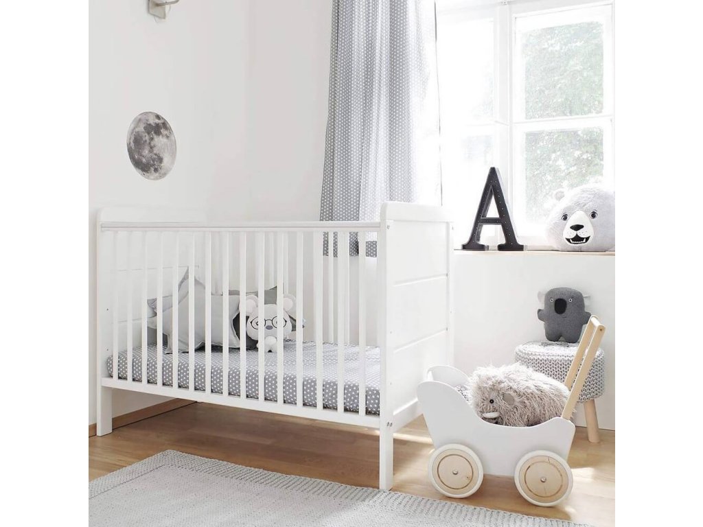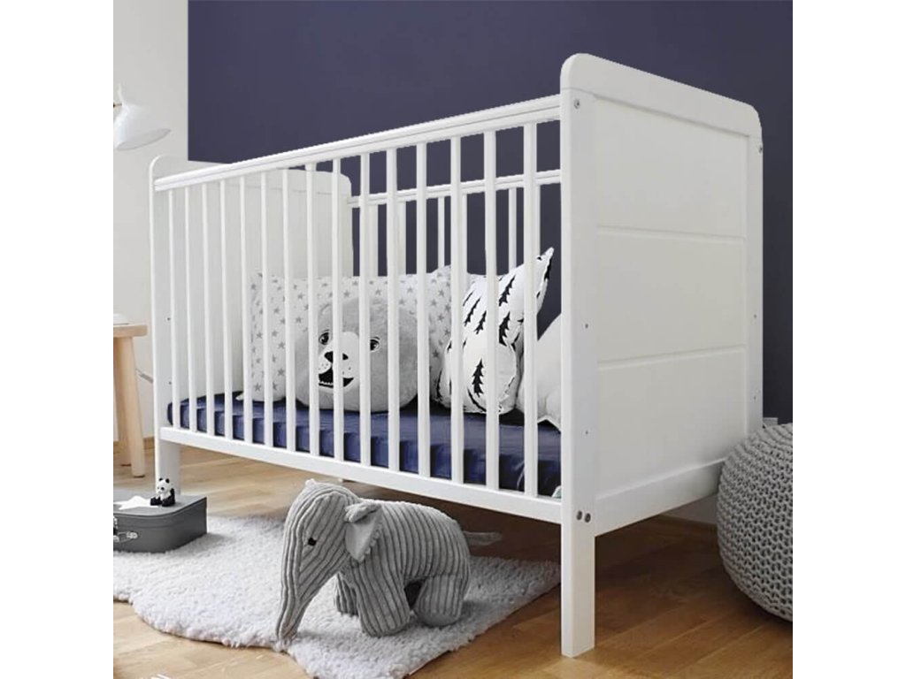 A MODERN Cot kiságy 60x120 cm minőségi tömör boroviból és MDF-ből készül. A babaágy két réteg minőségi tanúsítvánnyal rendelkező fehér félig matt festékkel van bevonvaa háttámláin pedig vízszintes csíkok találhatók. A kiságy fekhelyének magassága három fokozatban állítható, három kivehető ráccsal rendelkezik. A felső oldalsó lécek "rágókákkal" védettek, melyek megóvják gyermekét attól, hogy esetleg lerágja a festéket. Az összeszerelése rendkívül egyszerű.