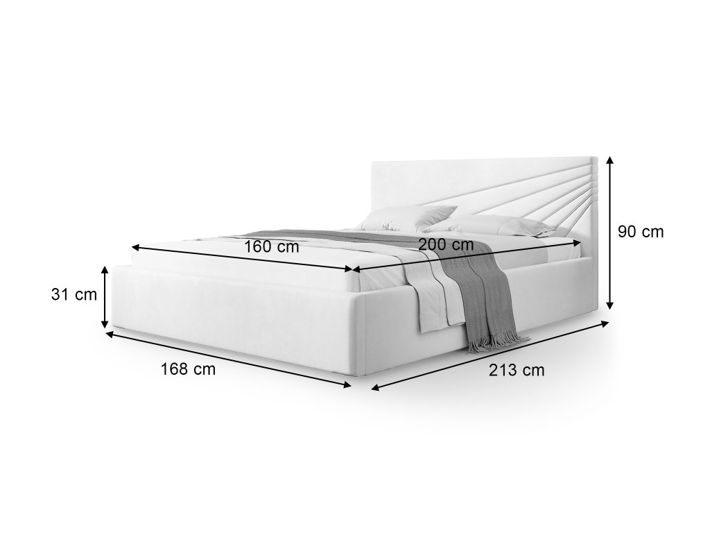 - Anyag: laminált lemez és fa keret / HDF lemezből készült tárolóhely / felnyitható fém ágyrács / Velluto 31 szövet kárpitozás