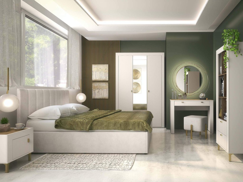 Szeretne modern stílust vinni az otthonába? A Mossa ruhásszekrény kasmírra emlékeztető bézs árnyalatban pontosan az, amit keres. A bordázott felületkezelésnek köszönhetően azonnal felkelti a figyelmet, és minden helyiségnek kifinomultságot kölcsönöz. A háromajtós dizájn tipikus nyitással klasszikus, ami sosem unalmas. A szekrény középső ajtaján praktikus tükör található, amely gyönyörűen optikailag nagyítja a helyiséget, és lehetővé teszi a gyors öltözékellenőrzést, mielőtt elindulna a világba. A szekrény nyolc stabil lábon áll, amelyek könnyed és modern megjelenést kölcsönöznek neki.