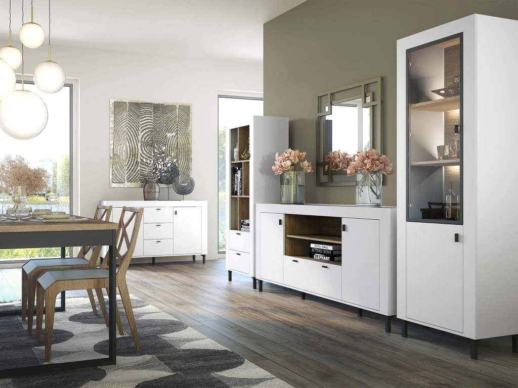 Frissítse fel otthonát az elegáns Mossa polcos szekrénnyel stílusos fehér színben. A polcos szekrény belső felületei vonzó whisky tölgy színűek, ami meleg és kellemes karaktert kölcsönöz a bútornak. A fehér külső és a tölgy belső közötti kontraszt harmonikus és modern megjelenést teremt, amely magára vonja a figyelmet. A Mossa polcos szekrény nemcsak esztétikailag kellemes, hanem praktikus is. Nyitott polcos része három tágas polcot tartalmaz, amelyek stílusosan vannak elválasztva, és elegendő helyet biztosítanak könyveinek, dekorációinak vagy egyéb kiegészítőinek. A polcos szekrény alsó része két fiókkal van felszerelve, amelyek külső felülete érdekes bordázott felülettel rendelkezik. Ez a részlet eredetiséget és érdekességet ad a polcos szekrénynek.