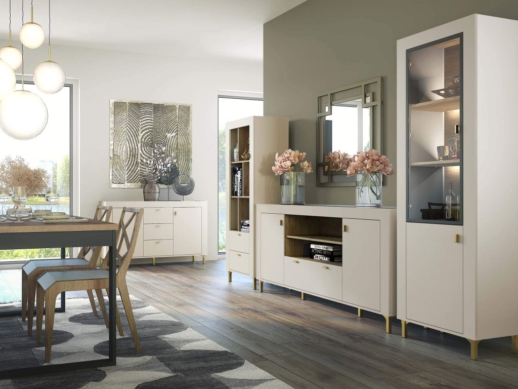 Több tárolóhelyre van szüksége, de ugyanakkor szeretné, ha otthonát stílusos bútor díszítené? A modern Mossa komód kiváló választás! Ezt az elegáns bútordarabot modern megjelenésre és praktikus használatra tervezték, ami ideális kiegészítővé teszi hálószobába, nappaliba vagy étkezőbe. A Mossa komód egyedi bordázott felülettel rendelkezik az ajtókon, amely karakteres megjelenést kölcsönöz a bútornak. A kasmírra emlékeztető bézs külső szín luxust és eleganciát hoz az enteriőrbe, míg a belső kialakítás és a felső lap whisky tölgy árnyalata érdekes kontrasztot teremt, kellemes és meleg hangulatot adva a térnek.