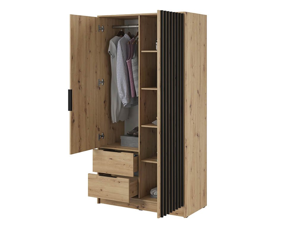 A NELLY 2D ruhásszekrény igazán praktikus és tágas bútor darab modern dizájnnal. A kétajtós szekrény 16 mm vastag laminált bútorlapból készül, fekete műanyag fogantyúkkal, a jobb oldalán pedig fekete dísz lamellákkal. A jobb ajtó mögött polcokat helyeztek el a ruháknak. A bal oldalon egy akasztórúd és két tágas fiók található.