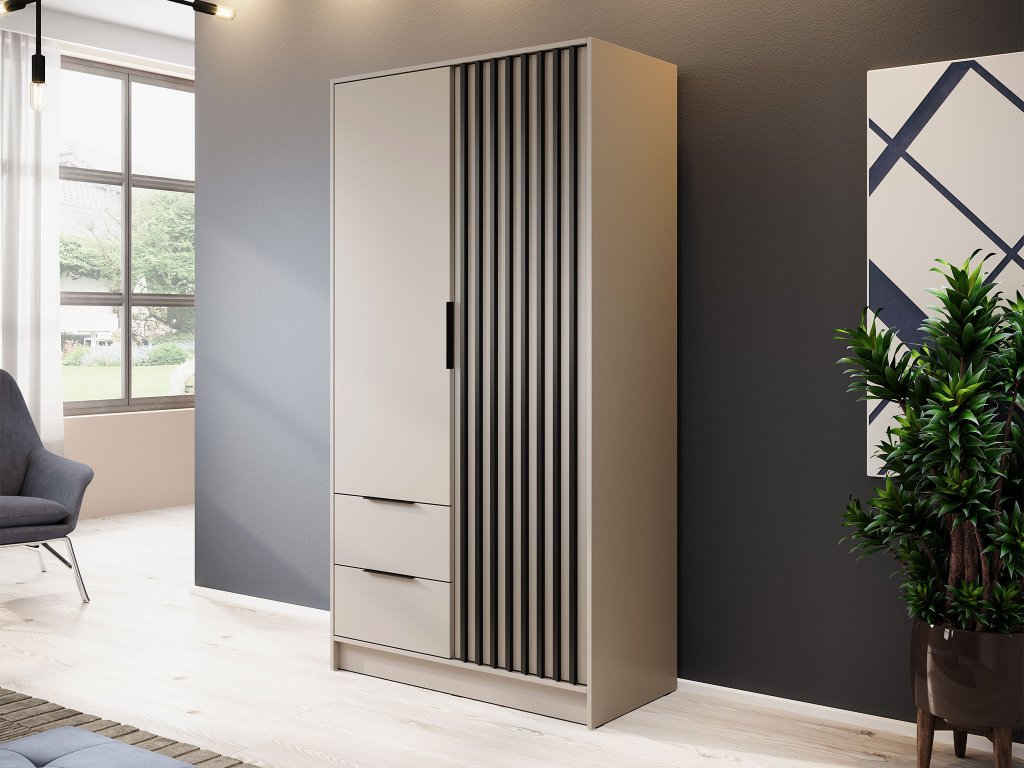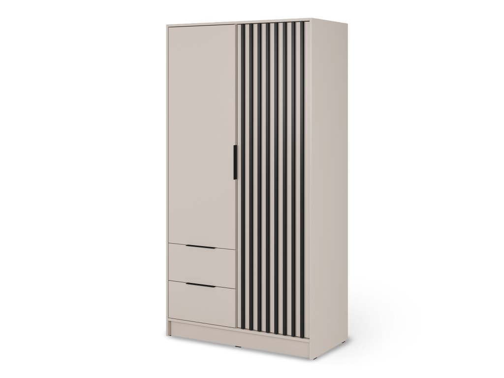 A NELLY 2D ruhásszekrény tökéletes választás, ha olyan bútort keres, amely ötvözi a praktikumot, az eleganciát és a modern dizájnt – legyen szó hálószobáról, előszobáról vagy akár gyerekszobáról. A kétajtós 16 mm vastag laminált bútorlapból készült erős szerkezet tartós és hosszú élettartamot garantál. A nyílóajtós szekrény kasmír színe és a fekete díszlamellák különleges vizuális kontrasztot hoznak létre, míg a fekete műanyag fogantyúk kiemelik a bútor letisztult, minimalista jellegét és kényelmes ajtónyitást biztosítanak.