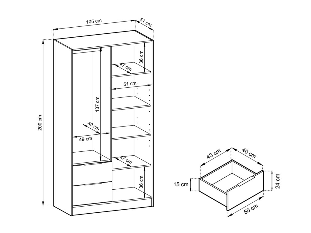 A szekrény jobb oldalában polcok kapnak helyet, amelyek ideálisak az összehajtott ruháknak, kiegészítőknek vagy más mindennapi tárgyaknak. A bal oldal egy akasztórúddal és két fiókkal van felszerelve. Ezek tökéletesek a fehérneműknek vagy kisebb holmiknak. A Nelly 2D szekrény minőségi anyagokból – laminált bútorlap, ABS élek és dekorlamellák – készül, így ellenálló, tartós és könnyen tisztán tartható.