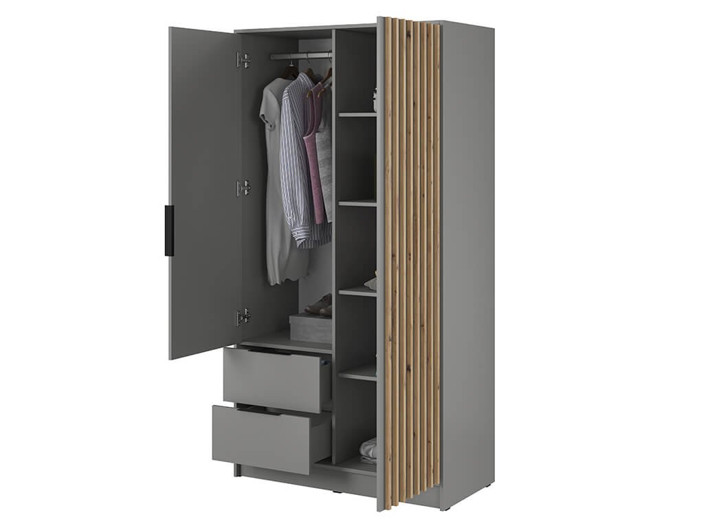 A NELLY 2D ruhásszekrény igazán praktikus és tágas bútor darab modern dizájnnal. A kétajtós szekrény 16 mm vastag laminált bútorlapból készül, fekete műanyag fogantyúkkal, a jobb oldalán pedig artisan tölgy színű dísz lamellákkal. A jobb ajtó mögött polcokat helyeztek el a ruháknak. A bal oldalon egy akasztórúd és két tágas fiók található. A műanyag fogantyúk fekete színben kaphatók.