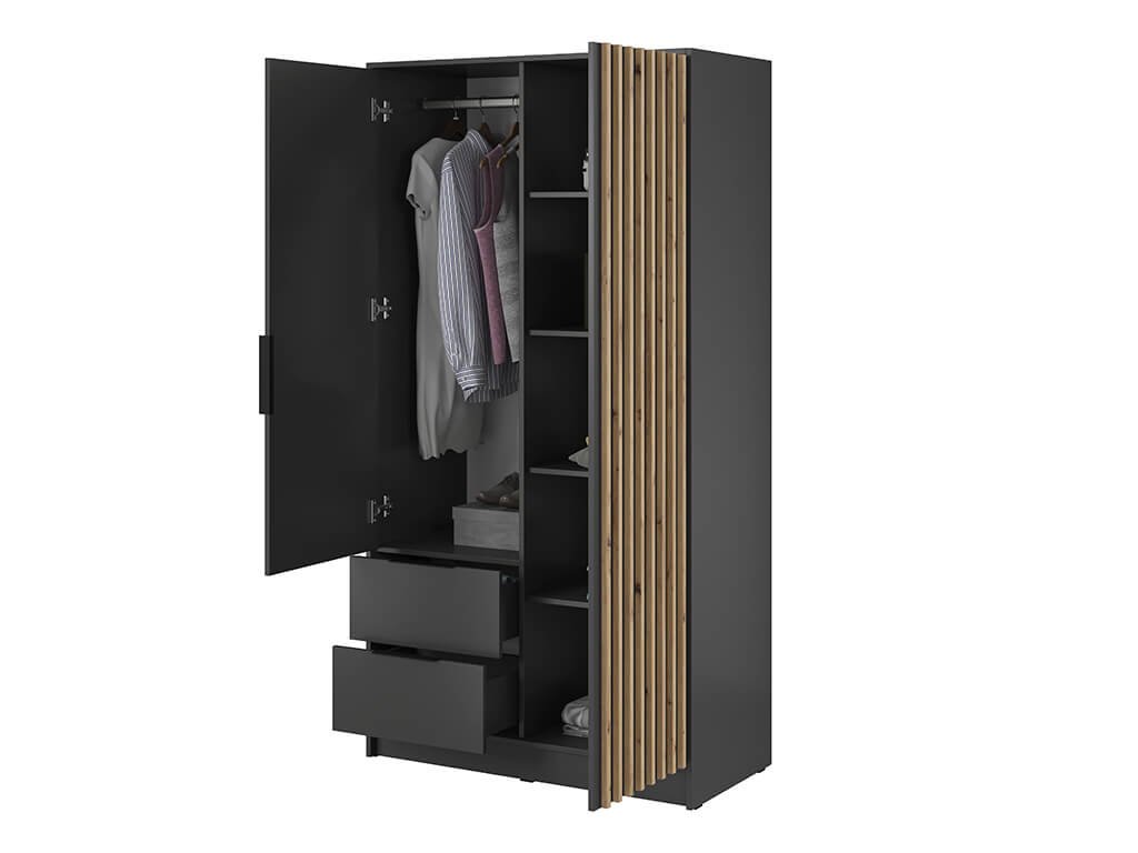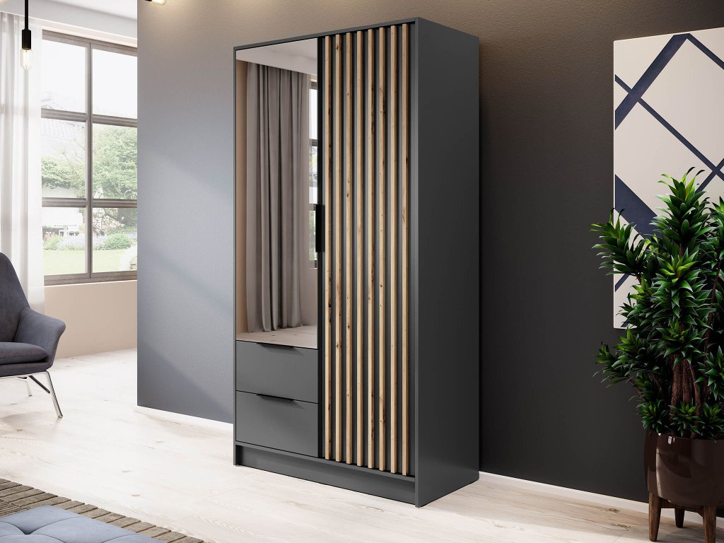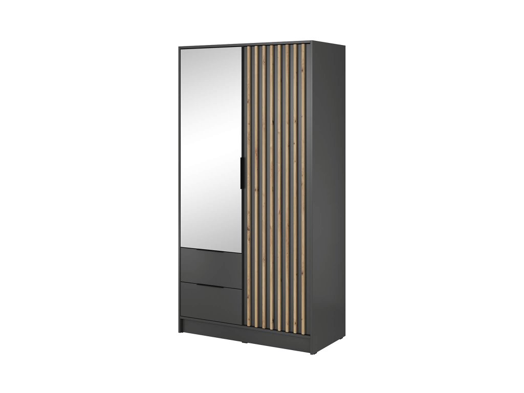 A sötétszürke és artisan tölgy kombinációjában készült tükrös NELLY 2D ruhásszekrény nem csak szép, de praktikus bútor darab is. A kétajtós szekrény 16 mm vastag laminált bútorlapból készül, fekete műanyag fogantyúkkal. A jobb oldalán fekete lamellák díszítik. A jobb ajtó mögött polcokat helyeztek el a ruháknak. A bal oldali ajtón egy praktikus tükör talált helyet, amely mögött egy akasztórúd található. Ez alatt két tágas fiók található.