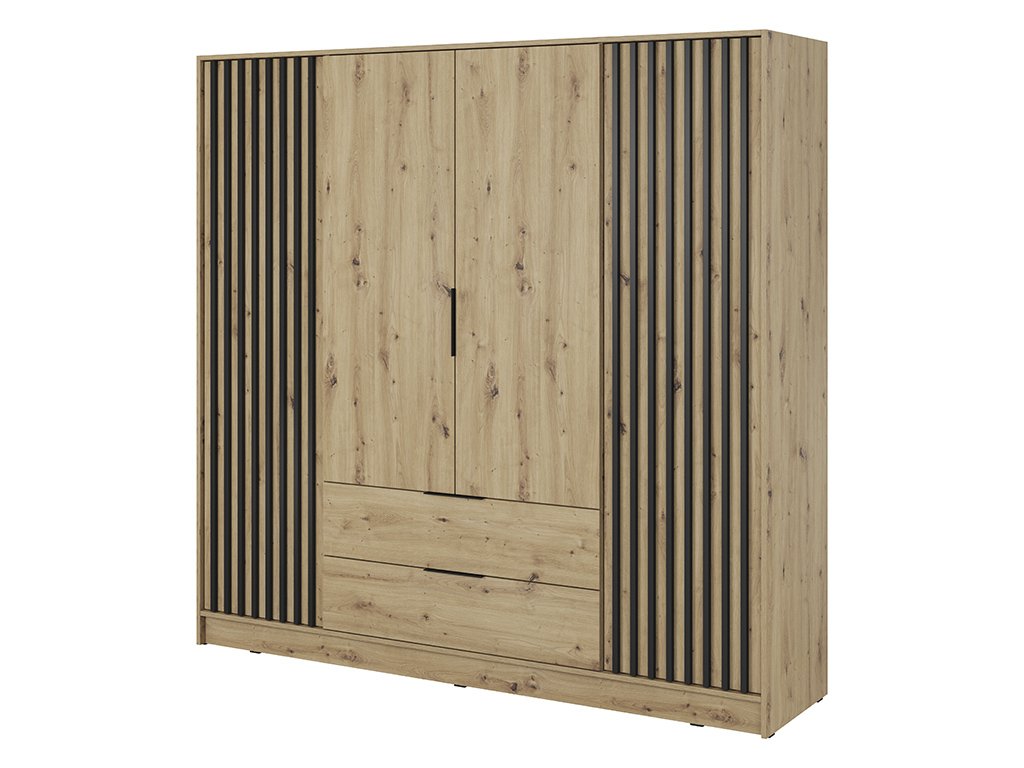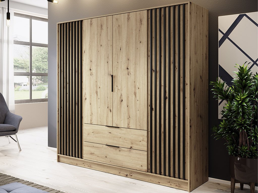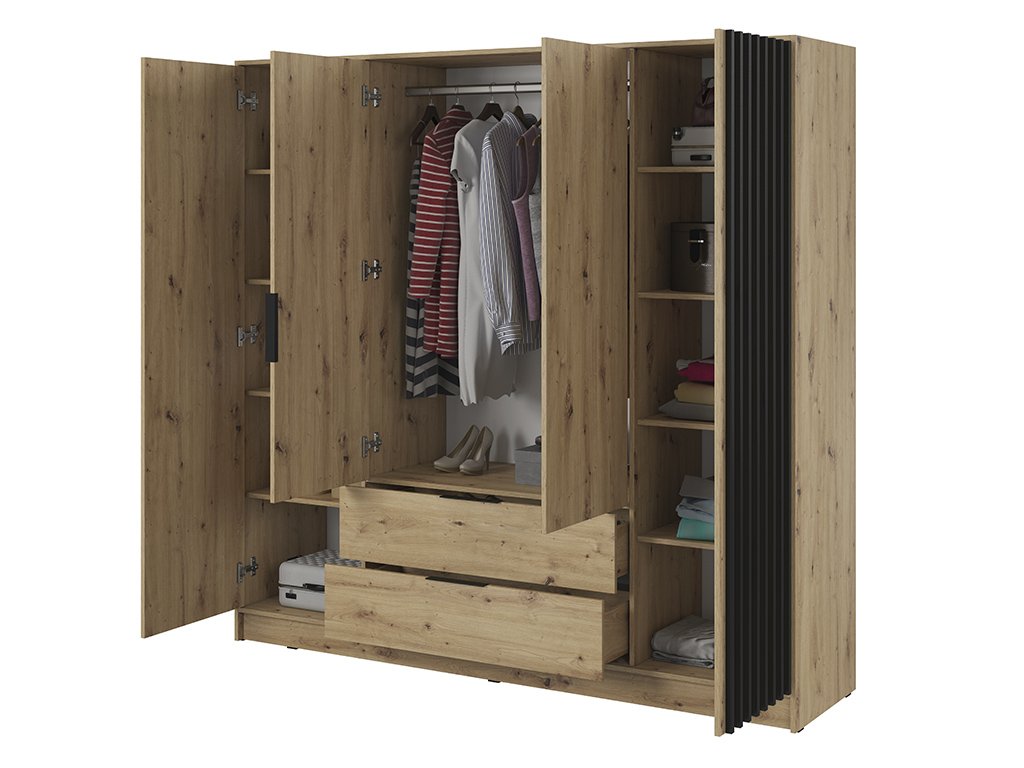 A NELLY 4D tágas és praktikus négyajtós gardróbszekrény artisan tölgy színben fekete dísz lamellákkal. A szekrény minőségi 16 mm vastag laminált bútorlapból készül, amely ABS élekkel van befejezve. A ruhásszekrény középső részében két tágas fiók és egy akasztórúd található. A szekrény két oldalában pedig a gyönyörű lamellákkal díszített ajtók mögött polcok találhatók. A szekrény fekete műanyag fogantyúkkal rendelkezik.