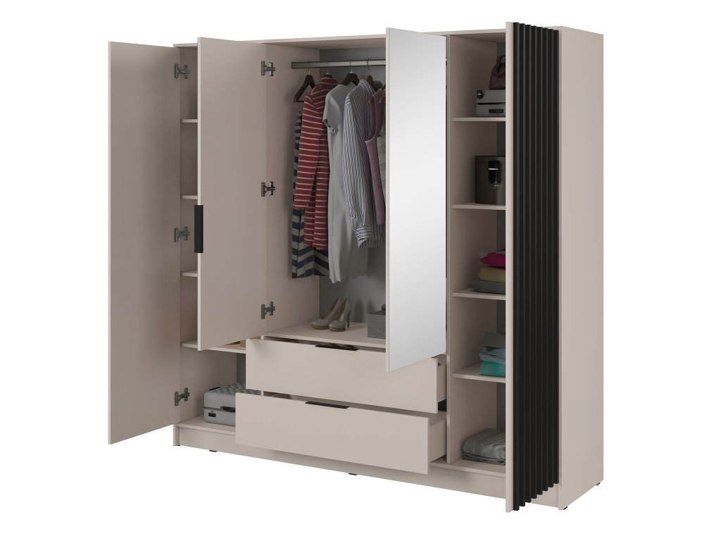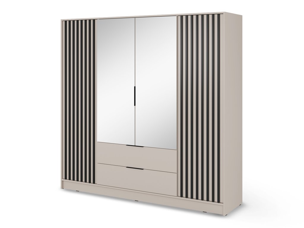 Ez az elegáns többajtós NELLY 4D gardróbszekrény nem csak számos új tárolóhelyet biztosít majd az otthonába, de nagyon stílusos is. A két középső ajtón elhelyezett tükörnek köszönhetően pedig igazán praktikus is. A négyajajtós kialakítása bőséges tárolóhelyet kínál, miközben a modern formavilág finom részletekkel időtálló és elegáns megjelenést ad a bútornak. Letisztult dizájnjának köszönhetően kiválóan illik a hálószobába, előszobába vagy akár a gyerekszobába, ifjúsági szobába is, ahol rendezett és harmonikus környezetet teremt. A ruhásszekrény 16 mm vastag laminált bútorlapból készült erős szerkezet tartós és hosszú élettartamot garantál. A nyílóajtós szekrény kasmír színe és a fekete díszlamellák különleges vizuális kontrasztot hoznak létre, míg a fekete műanyag fogantyúk kiemelik a bútor letisztult, minimalista jellegét és kényelmes ajtónyitást biztosítanak.