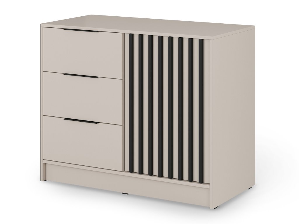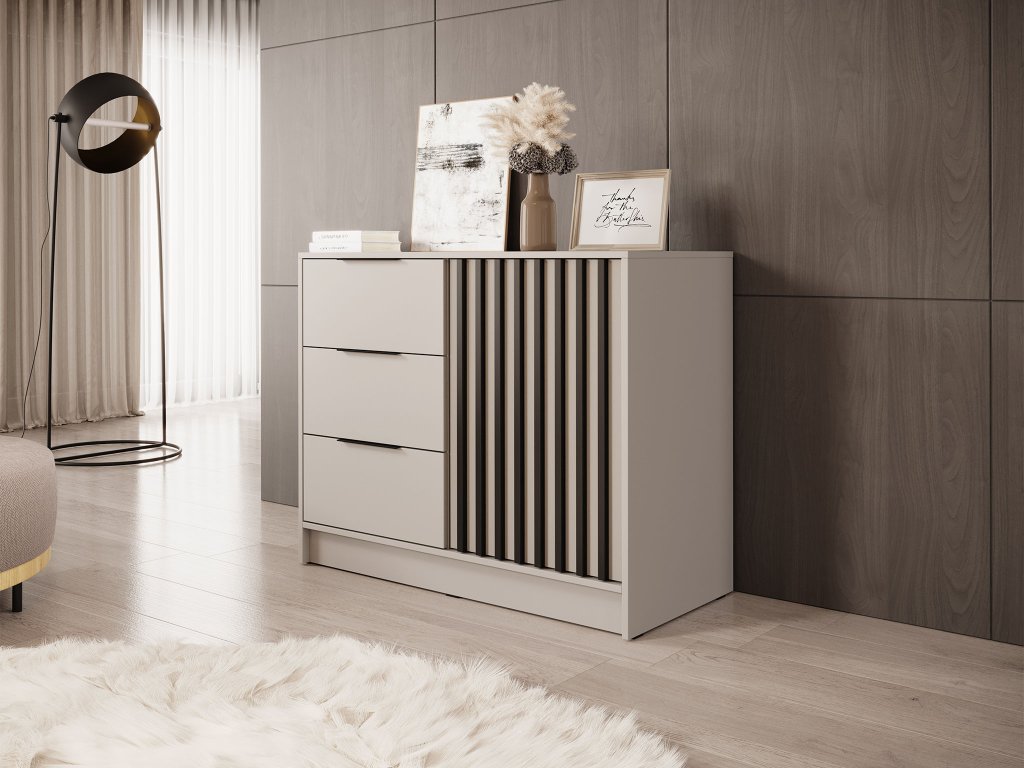 A komód bal oldalában három tágas fiók található, amelyekben kényelmesen elférnek a kisebb tárgyak, fehérneműk vagy dokumentumok. A jobb oldalon az ajtó mögött egy praktikus polc kapott helyet, ahová nagyobb dolgokat is el lehet pakolni. A komód megjelenését a fekete díszlamellák és a fekete műanyag fogantyúk teszik teljessé, elegáns kontrasztot adva a bútor finom színéhez. A komód teteje ideális a dekorációk, virágok vagy a családi fényképek számára.
