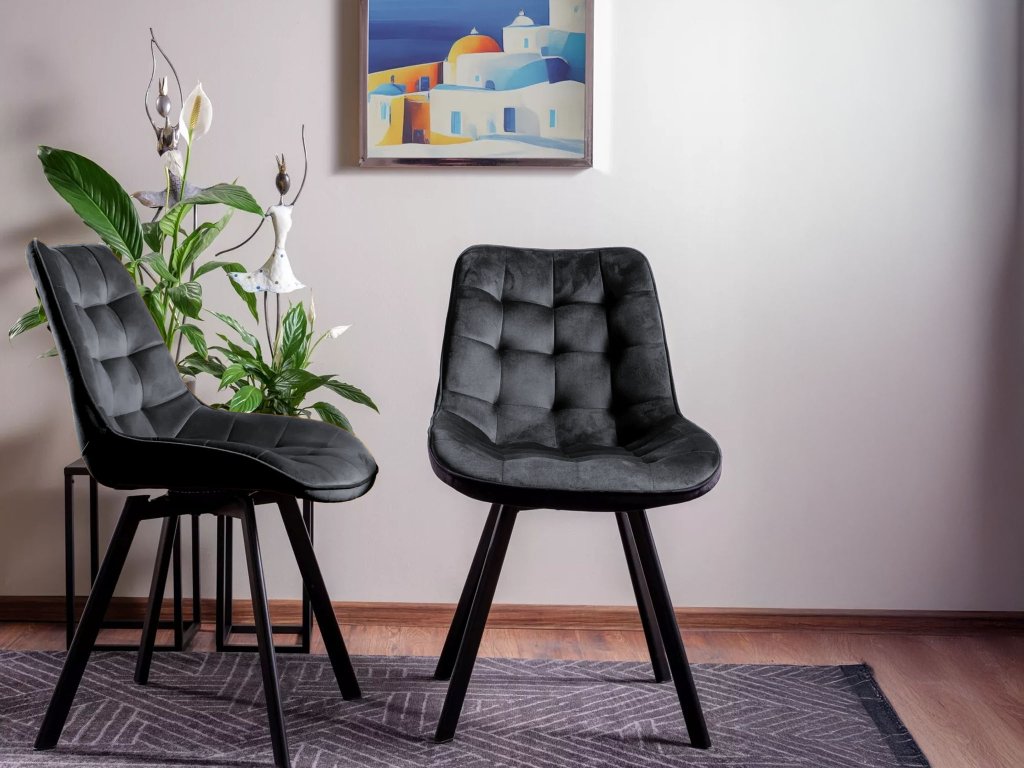 A NOTTI étkezőszék a bársonyos huzat eleganciáját ötvözi a fém lábak masszív megjelenésével. Igazán jó választás lehet egy modern étkezőbe vagy konyhába. A lágy steppeléssel rendelkező fekete velúr szövet kifinomult megjelenést kölcsönöz a széknek, amely már első pillantásra megragadja a figyelmet. A fém vázzal rendelkező étkezőszék stabil szerkezete hosszú élettartamot és megbízhatóságot biztosít, míg a puha kárpitozás kivételes kényelmet nyújt ülés közben. Legyen szó egy családi reggeliről, egy hosszú barátokkal eltöltött hétvégi vacsoráról vagy az asztal mellett munkával eltöltött időről – a Notti szék mindig gondoskodik majd a kényelemről. Kompakt méretének köszönhetően könnyen mozgatható, könnyű szerkezete pedig lehetővé teszi a problémamentes áthelyezést. A szék 180 fokban forgatható.