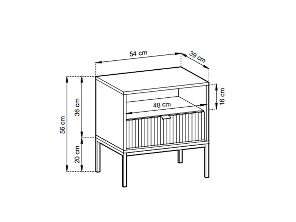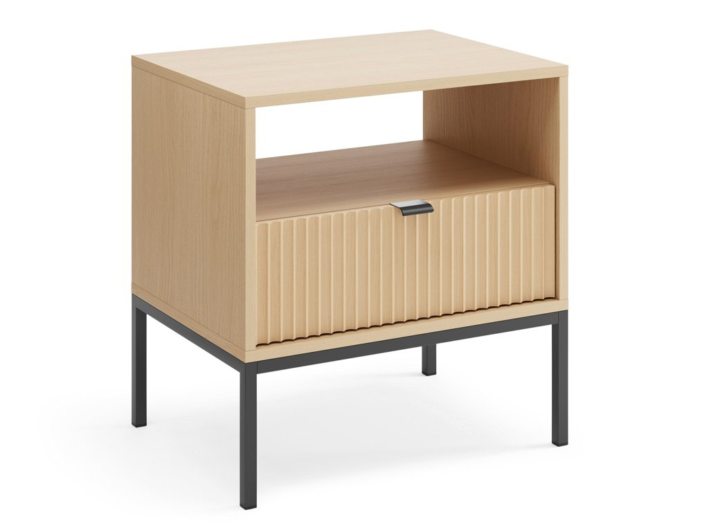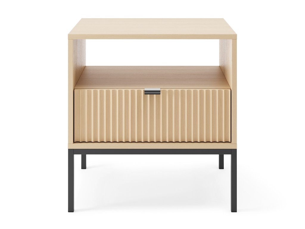 Nočný stolík Nova úgy lett tervezve, hogy minden szükséges dolog kéznél legyen. Az nyitott polc ideális könyvek, magazinok, vagy díszek számára, míg a fekete fogantyús fiók apróságokat, szemüveget vagy kozmetikumokat tárol. Az asztal praktikus megoldása és tiszta vonalai könnyen alkalmazkodnak a modern, minimalista vagy klasszikus hálószoba stílusához, miközben megőrzik a rendet és az elegáns megjelenést.