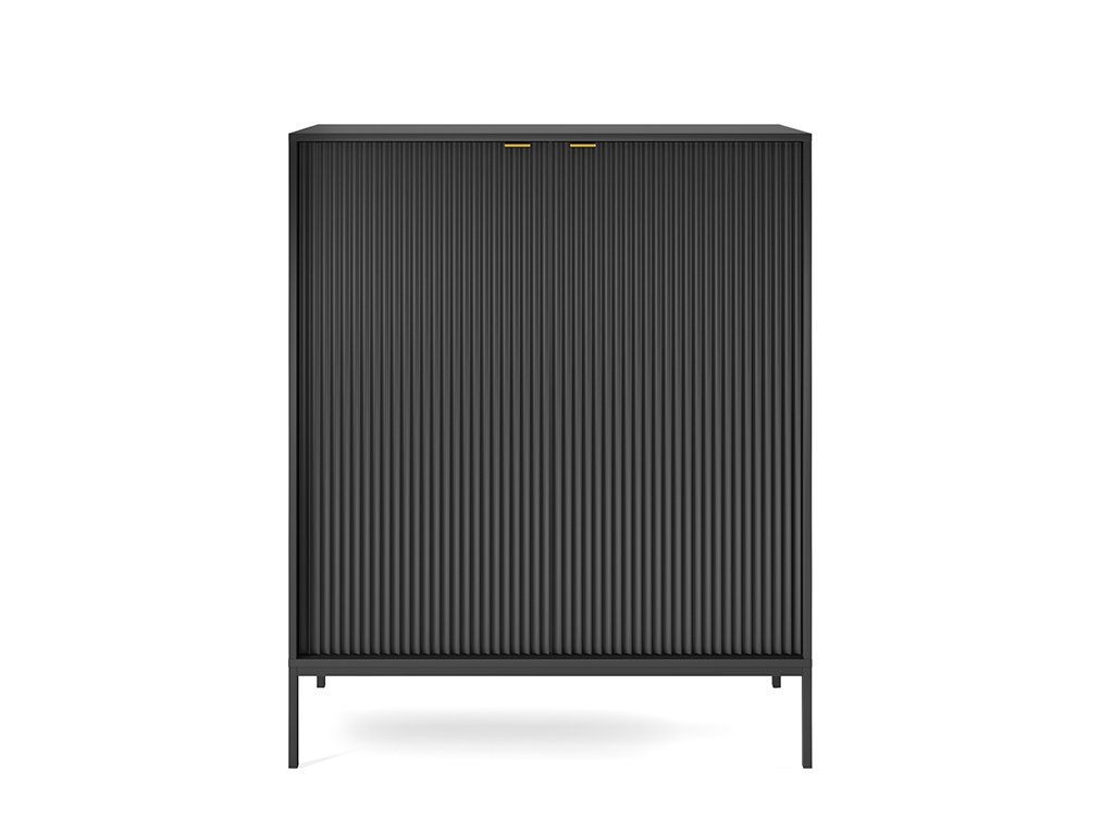 A fekete színben készült magas NOVA K104 komód a nappali vagy az előszoba dísze lesz. A nyújtott tároló helyének köszönhetően minden megtalálja a maga helyét. A két ajtó mögött összesen négy polc helyezkedik el.