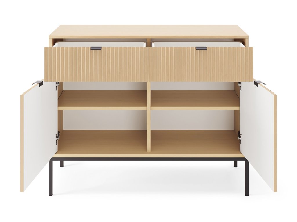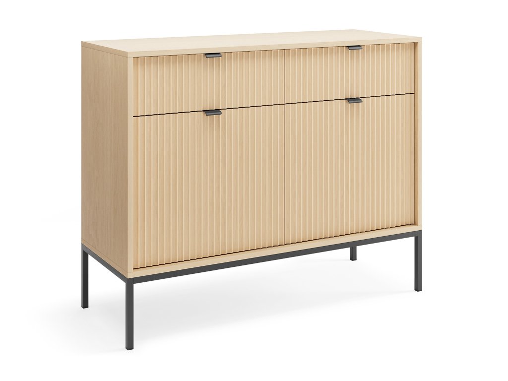 A komód tervezésénél ügyeltek arra, hogy elegendő tárolóhelyet biztosítson majd a szobában. A felső részében praktikus fiókok találhatók, amelyek ideálisak a dokumentumoknak vagy apróságoknak. Alattuk egy kétajtós kis szekrény található, amely két részre van osztva és egy polcot rejt.