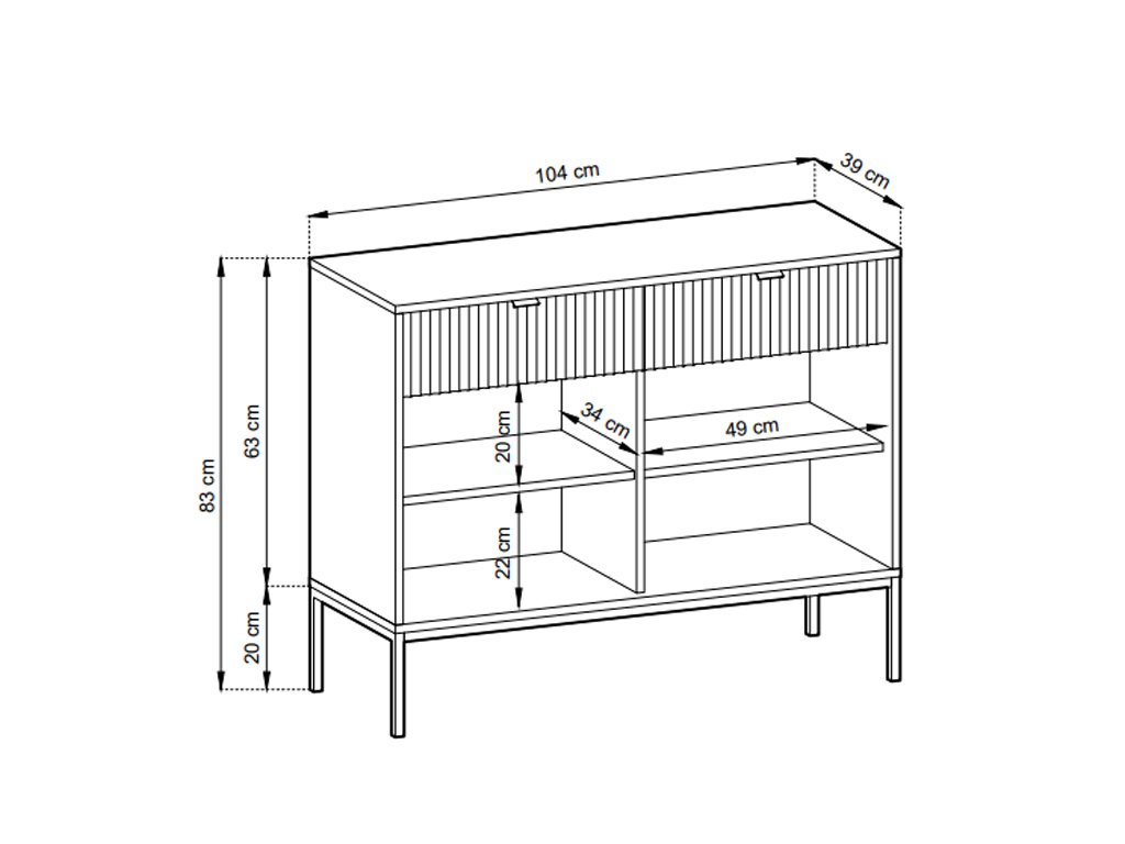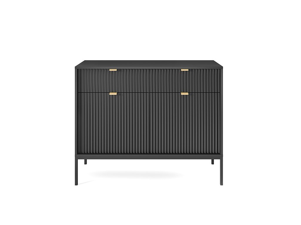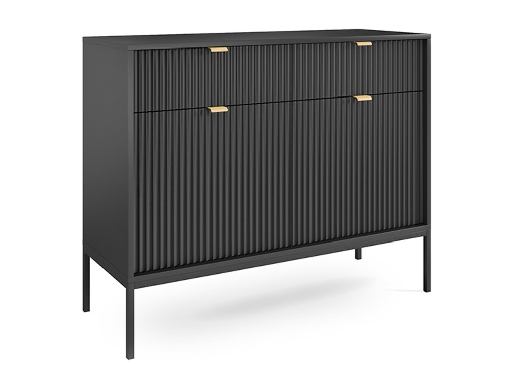 Elegáns fekete színű NOVA KSZ104 komód, amely segít praktikusan és elegánsan berendezni a szobát. Tágas tároló helyet kínál, így végül mindennek megtalálja majd a helyét. A kétajtós szekrény fölött két fiók található. A szekrény részben pedig egy polcot helyeztek el.