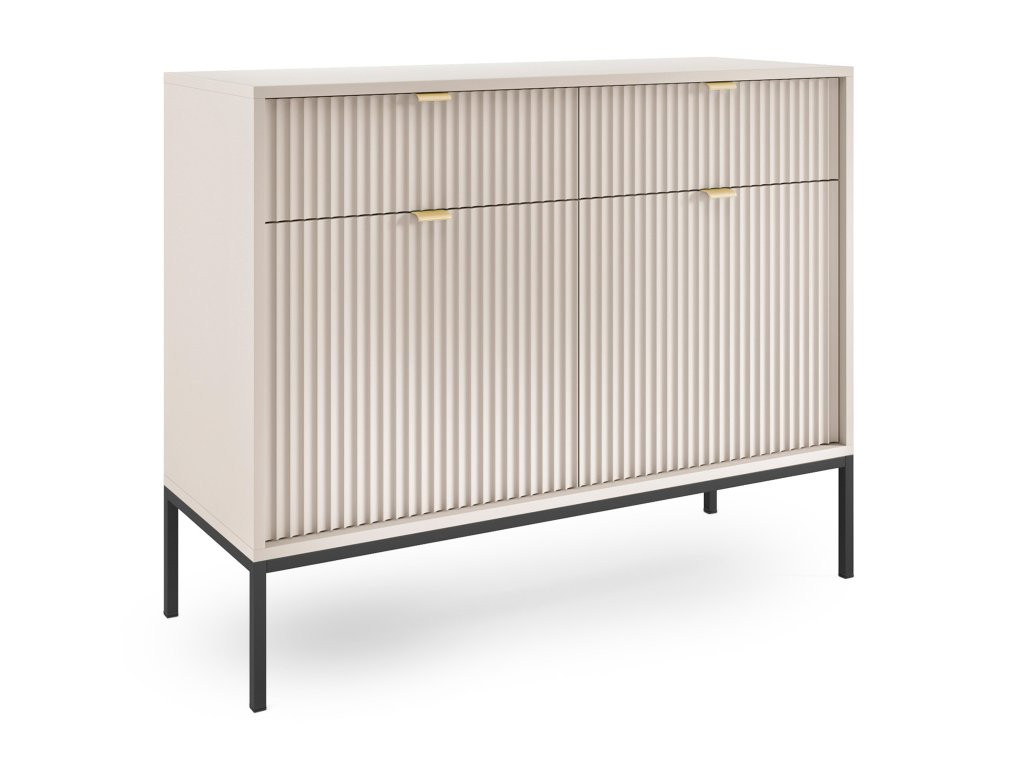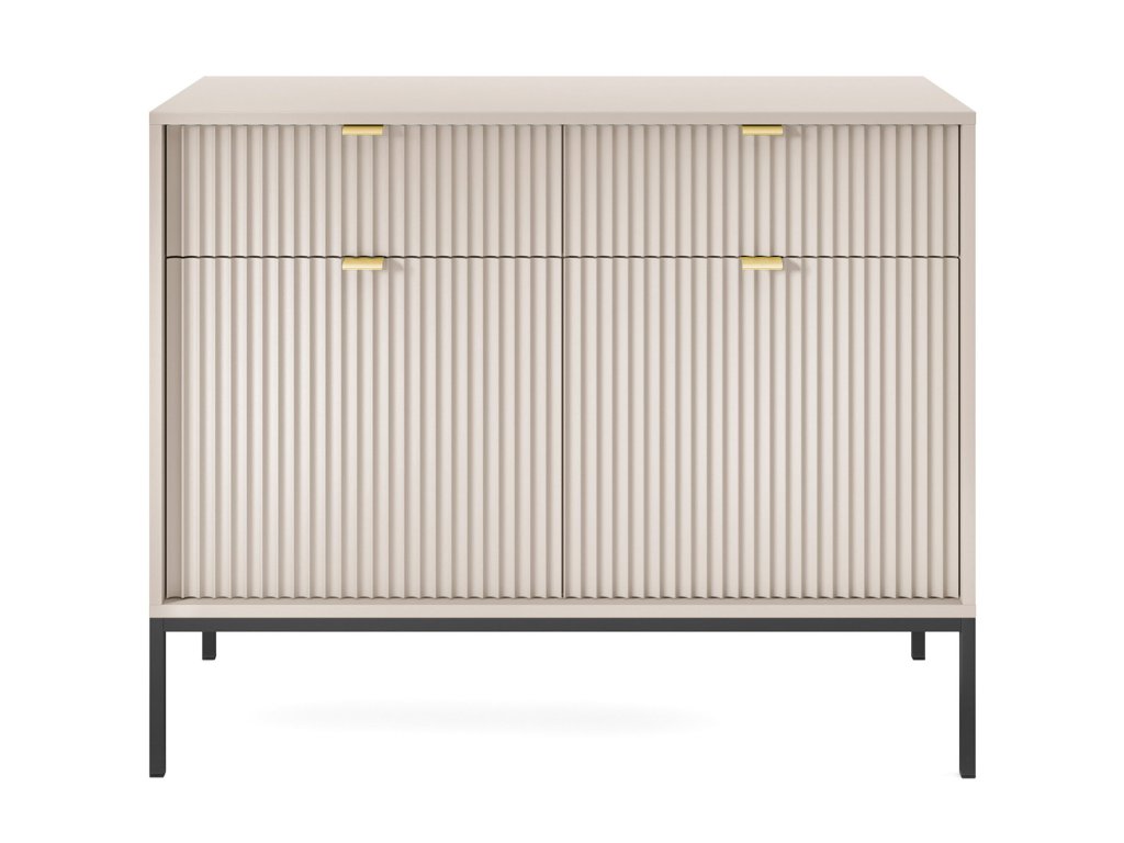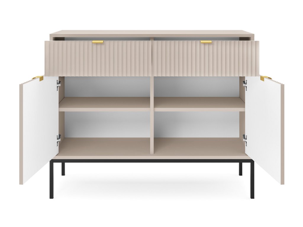 A NOVA KSZ104 komód kasmír színben elegáns, mégis letisztult megjelenést visz otthonba. Az előlapjait finom, bordázott marás díszíti, amely kifinomult, modern hatást kelt. Az arany színű fogantyúk tovább erősítik az összhatást: luxusosak, mégis ízlésesen visszafogottak. A fekete fém lábak légies, modern karaktert adnak a bútornak. A szerkezete ellenálló laminált bútorlapból, az előlap pedig precízen megmunkált MDF-ből készül, így a komód hosszú távon is megőrzi stabilitását és szépségét. A Nova KSZ104 nemcsak mutatós darab, hanem praktikus és strapabíró kiegészítője is lesz otthonának.