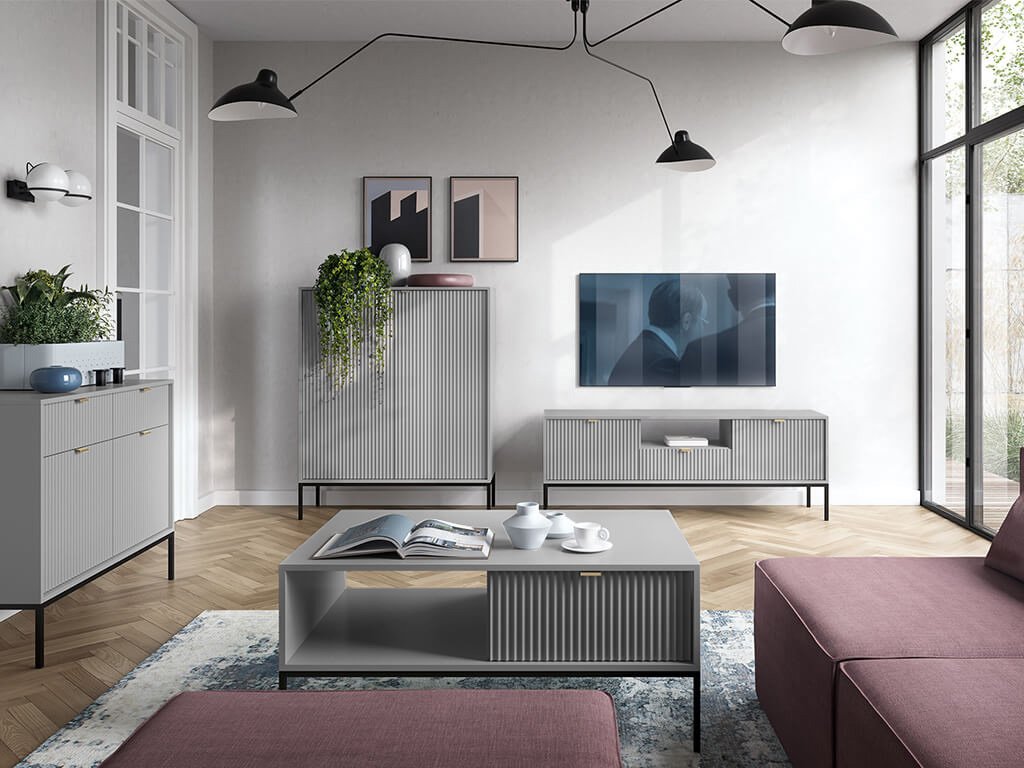 A hihetetlenül modern és stílusos NOVA bútor kollekció nem hiányozhat egyetlen divatos otthonból sem. A bútor luxusos, gyönyörű és különleges bordázott előlapjait remekül kiegészítik a csiszolt arany színű alumínium fogantyúk. A könnyedségét a fekete fém vázas szerkezet biztosítja magas lábakkal. A Nova bútor család kasmír, fehér, szürke és fekete színváltozatokban is elérhető, így igényei szerint választhat közülük. A Nova bútor szett segítségével modern nappalit rendezhet be, azonban egyes bútor darabokat elhelyezhet az előszobába, a dolgozószobába, az étkezőbe vagy a hálószobába is. A bútor alapját laminált DTD bútorlap alkotja, míg az előlapok MDF bútorlapból készülnek.