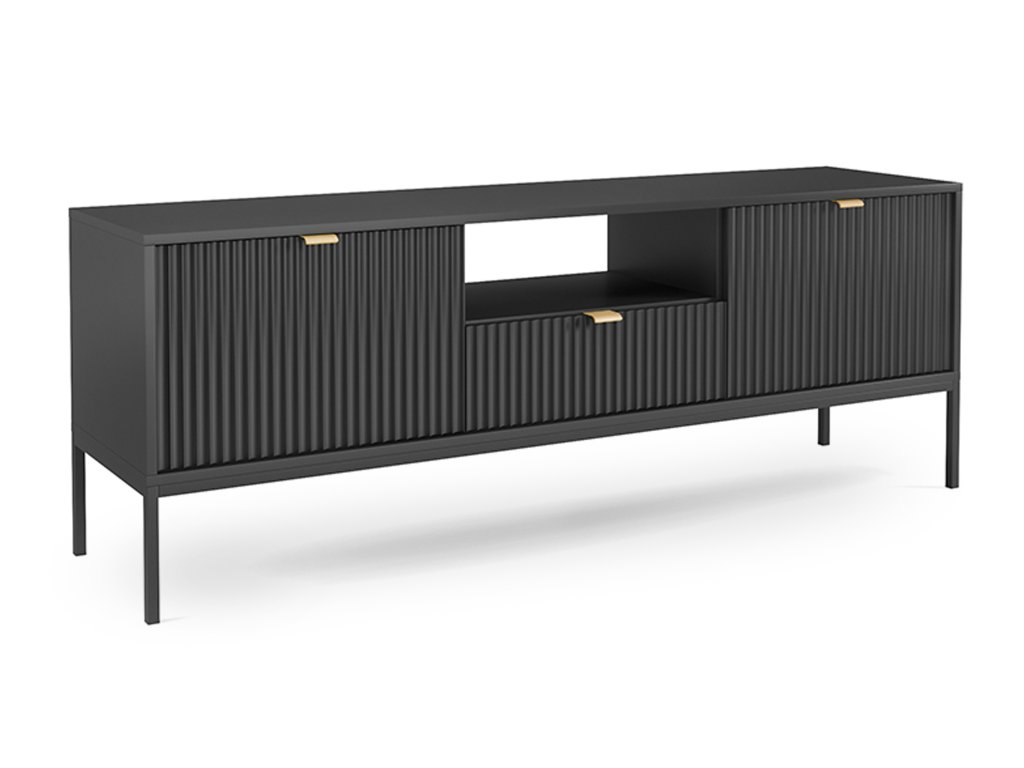 NOVA RTV154 fekete tévés szekrény, amely helyet biztosít a televíziónak. Szép bordázott előlapokkal és arany színű fogantyúkkal rendelkezik. Egy nyitott polccal, egy fiókkal és két kis szekrénnyel rendelkezik.