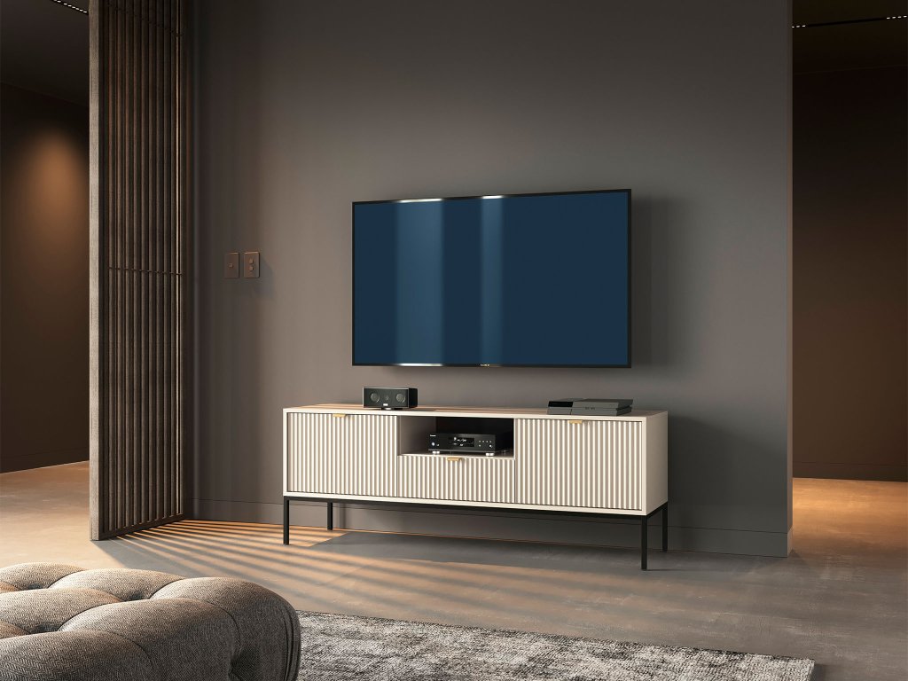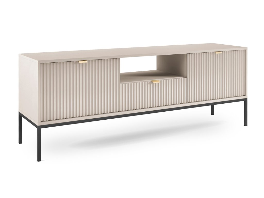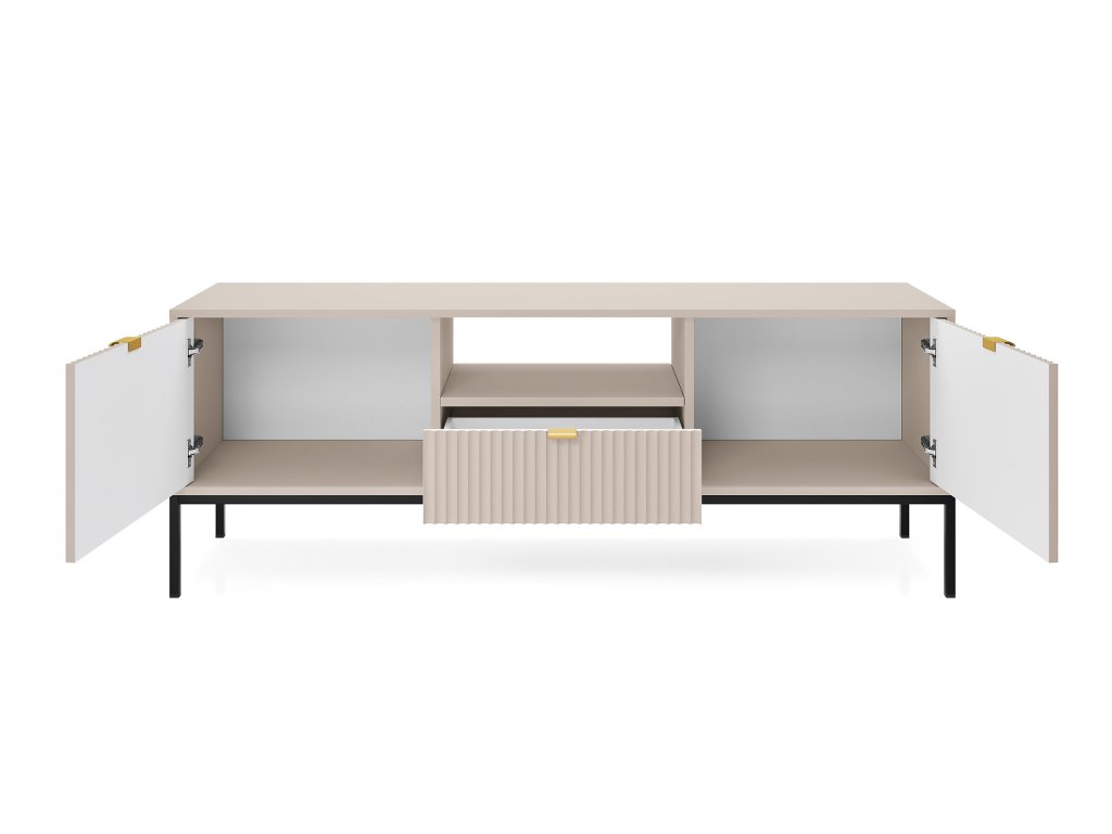 A NOVA RTV154 tévés szekrény lágy kasmír színben tökéletes választás minden nappaliba. A gyönyörű kialakításának és a precíz részleteinek köszönhetően egy igazán minőségi bútordarabot kap. Az arany színű fogantyúk tovább erősítik az összhatást: luxusosak, mégis ízlésesen visszafogottak. A fekete fém lábak légies, modern karaktert adnak a bútornak. A szerkezete ellenálló laminált bútorlapból, az előlap pedig precízen megmunkált MDF-ből készül, így a komód hosszú távon is megőrzi stabilitását és szépségét.