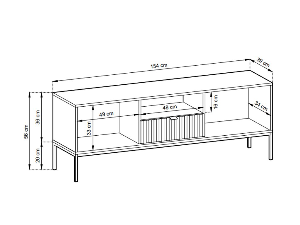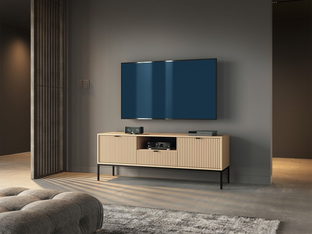TV asztal Nova tölgy vicenza dekorációval természetes megjelenést és modern hangulatot kölcsönöz a nappalinak. A fekete fém fogantyúk és a magas lábak elegáns kontrasztot teremtenek, egyúttal megkönnyítik a takarítást az asztal alatt. A finom barázdálás az előlapokon vizuális mélységet és kifinomult részletet ad, míg a laminált DTD váz és az MDF elülső rész biztosítja a tartósságot és hosszú élettartamot a mindennapi használat során.
