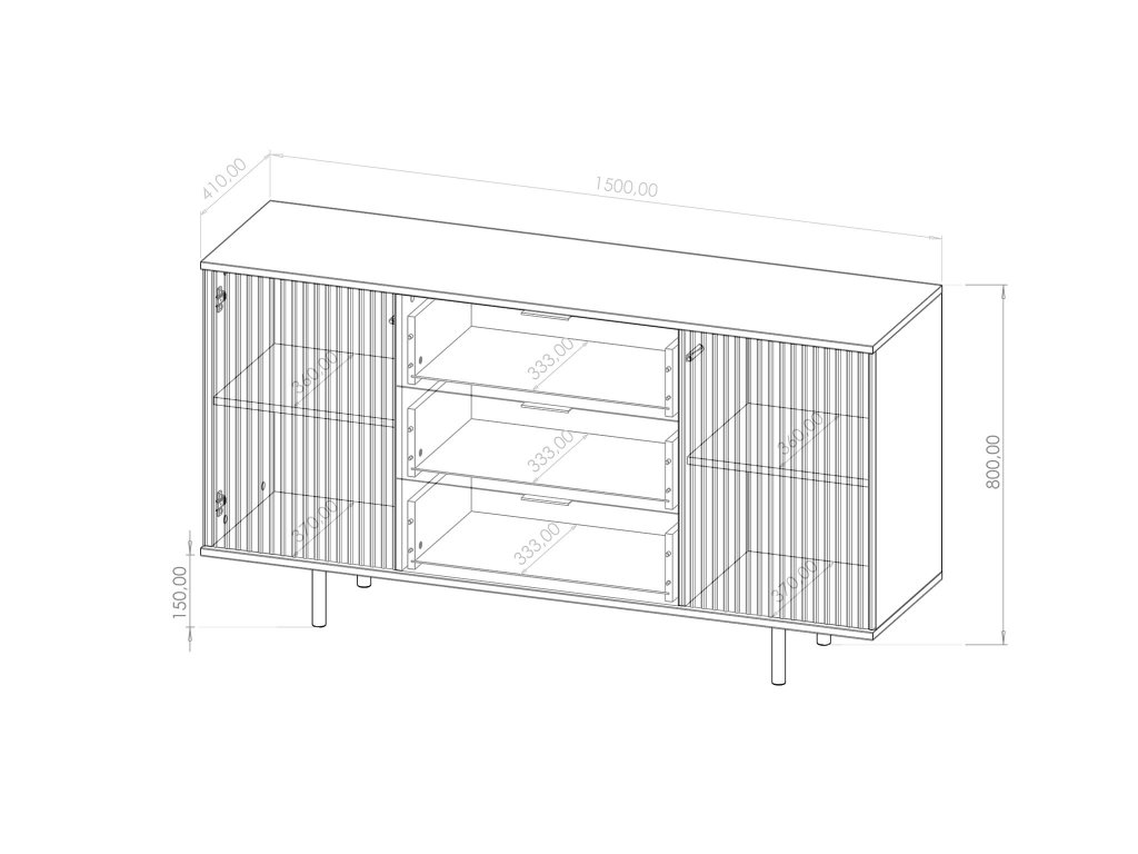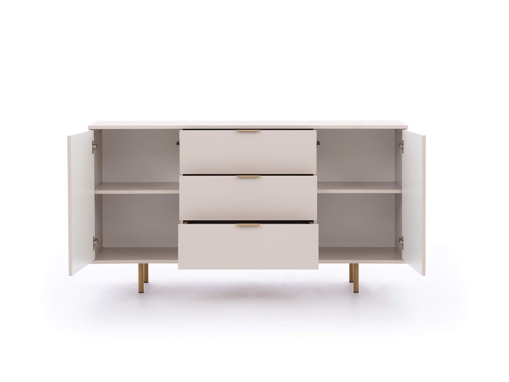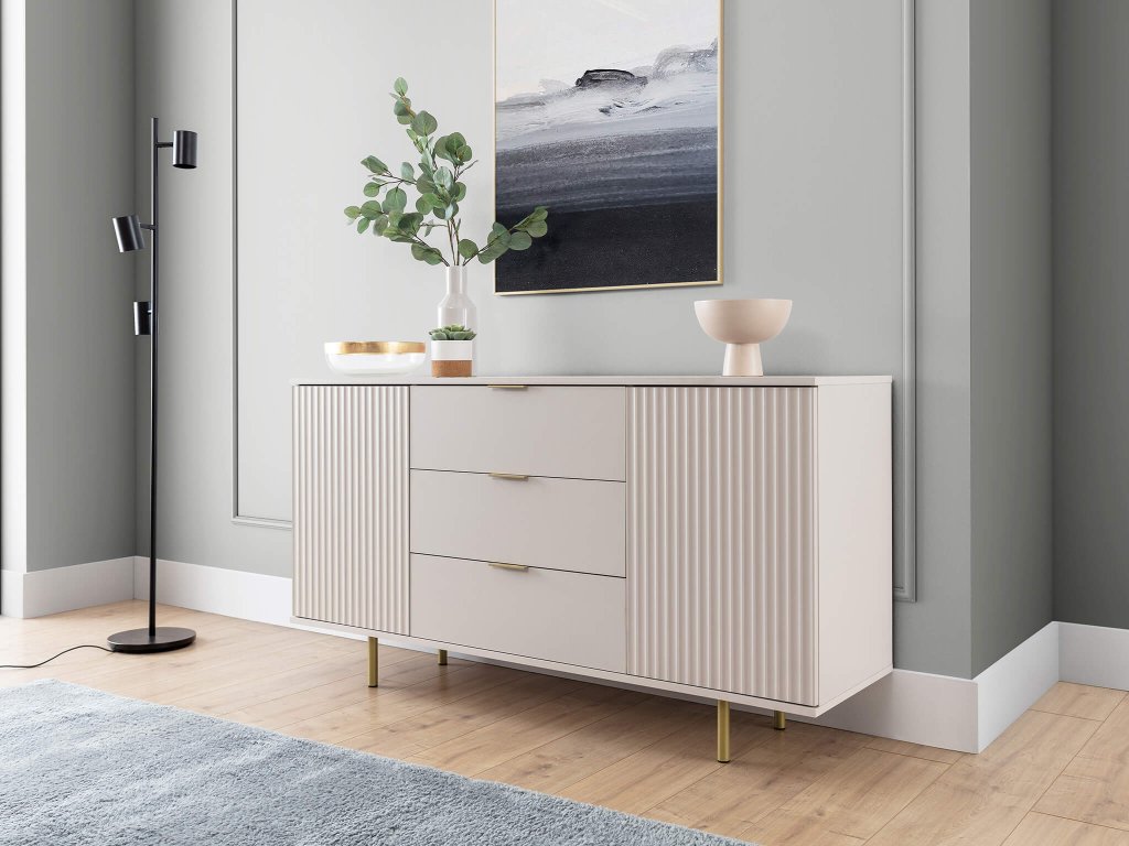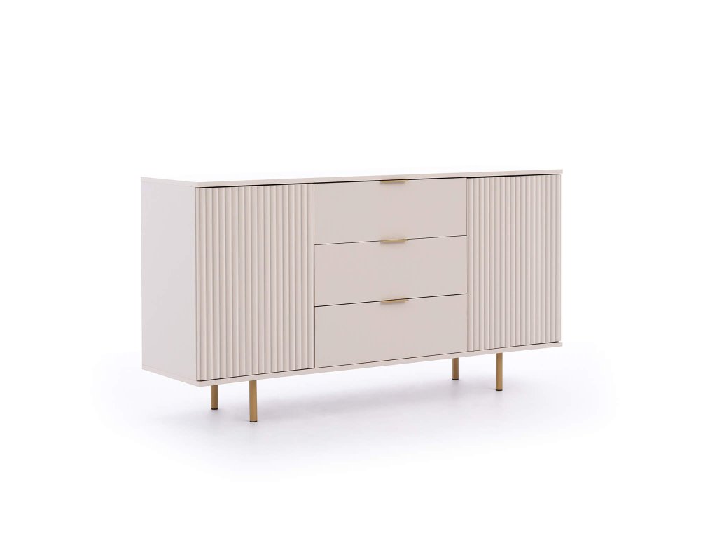 Hihetetlenül elegáns és stílusos NUBIA NB-02 komód, amely nem hiányozhat egyetlen modern otthonból sem. 3D hatású előlapokkal és arany színű fém fogantyúkkal és lábakkal van ellátva. A 15 cm magas lábaknak köszönhetően a bútor nagyon légies, elegáns és luxusos kinézettel rendelkezik. A komód számos tároló helyet kínál a három fióknak és a két ajtós szekrénynek köszönhetően. A komód tetejére pedig elhelyezheti a dísztárgyait, növényeit vagy a családi fényképeket. Tökéletes választás a nappaliba, a folyosóra vagy a dolgozószobába is. Az ajtók és a fiókok push-to-open, azaz úgynevezett fogantyú nélküli rendszerrel nyithatók.