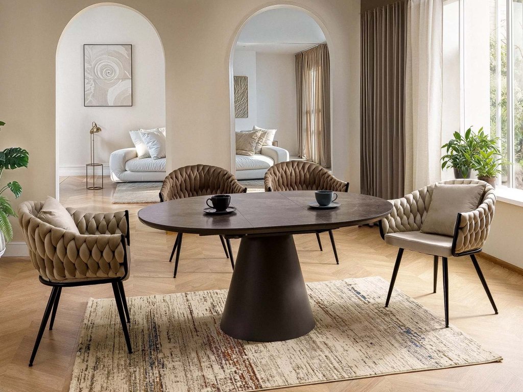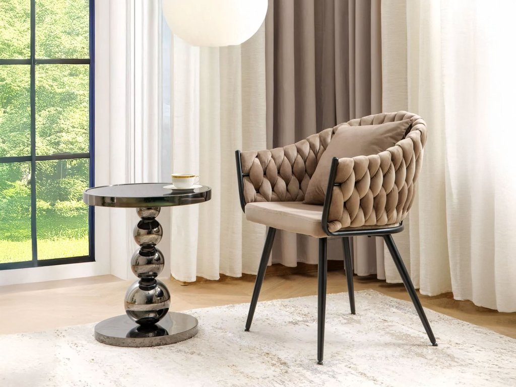 Nuvo fotel – az elegancia és a modern kényelem összekapcsolása. A Nuvo fotel már első pillantásra lenyűgöz időtálló dizájnjával, amely ötvözi a fonott bájt a modern esztétikával. A sötét bézs színű kárpit puha bársonyos anyagból luxus megjelenést kölcsönöz a fotelnek, miközben kellemes tapintású kényelmet biztosít.