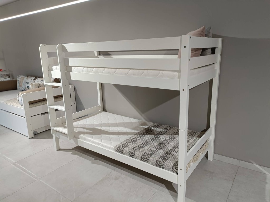 OLAF fehér emeletes ágy 90 x 190 cm, amely tömör borovi fenyőből készül. Az ágy fehér lakkal van lakkozva, amely megfelel minden erre vonatkozó biztonsági normának és előírásnak, így gyerekek számára is biztonságos. A felhasznált anyagoknak köszönhetően az emeletes ágy magas minőségű és stabil szerkezettel rendelkezik. Az ágy élei le vannak kerekítve, hogy biztonságban tudhassa gyermekét. A modern dizájnnak köszönhetően az ágy lányos és fiús gyerekszobába is megfelelő választás. Az ágy univerzális, a létra kétoldalas, jobbosan és balosan is össze lehet szerelni. Az ágy szükség esetén szétszedhető két különálló fekhelyre. Az emeletes ágy léces ágyráccsal együtt kapható.
