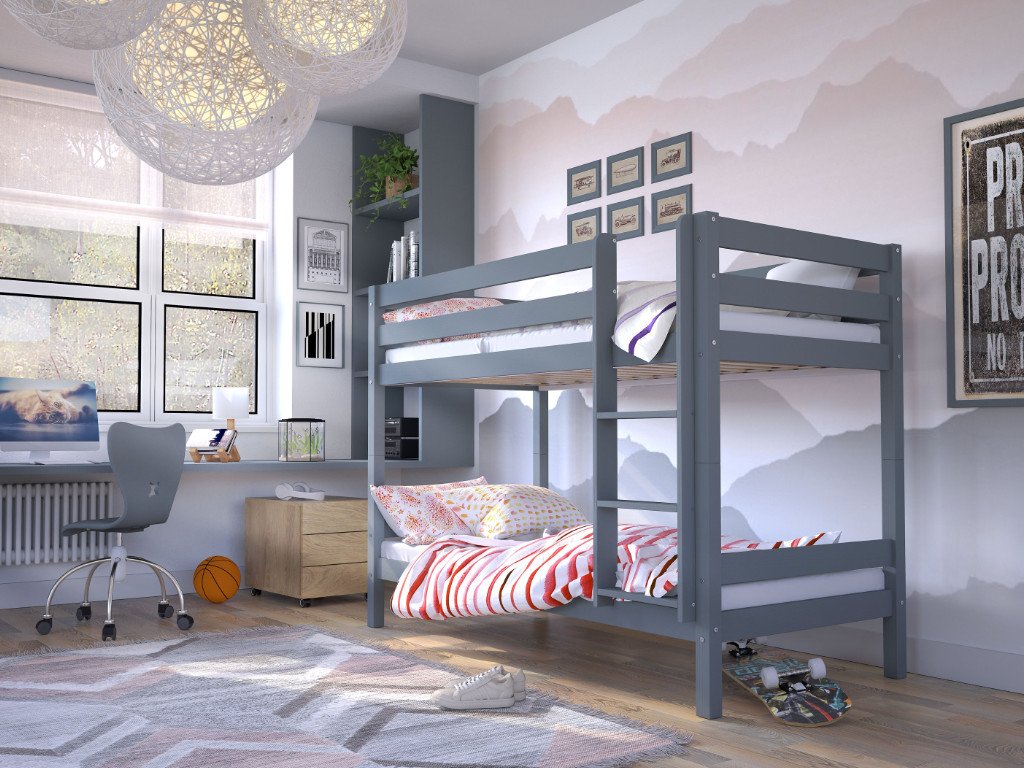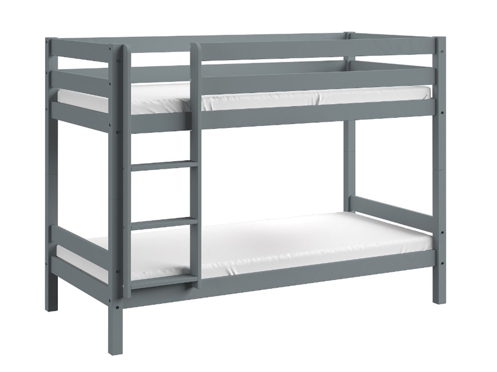 OLAF szürke emeletes ágy 90 x 190 cm, amely tömör borovi fenyőből készül. Az ágy szürke lakkal van lakkozva, amely megfelel minden erre vonatkozó biztonsági normának és előírásnak, így gyerekek számára is biztonságos. A felhasznált anyagoknak köszönhetően az emeletes ágy magas minőségű és stabil szerkezettel rendelkezik. Az ágy élei le vannak kerekítve, hogy biztonságban tudhassa gyermekét. A modern designnak köszönhetően az ágy lányos és fiús gyerekszobába is megfelelő választás. Az ágy univerzális, a létra kétoldalas, jobbosan és balosan is össze lehet szerelni. Az ágy szükség esetén szétszedhető két különálló fekhelyre. Az emeletes ágy léces ágyráccsal együtt kapható.