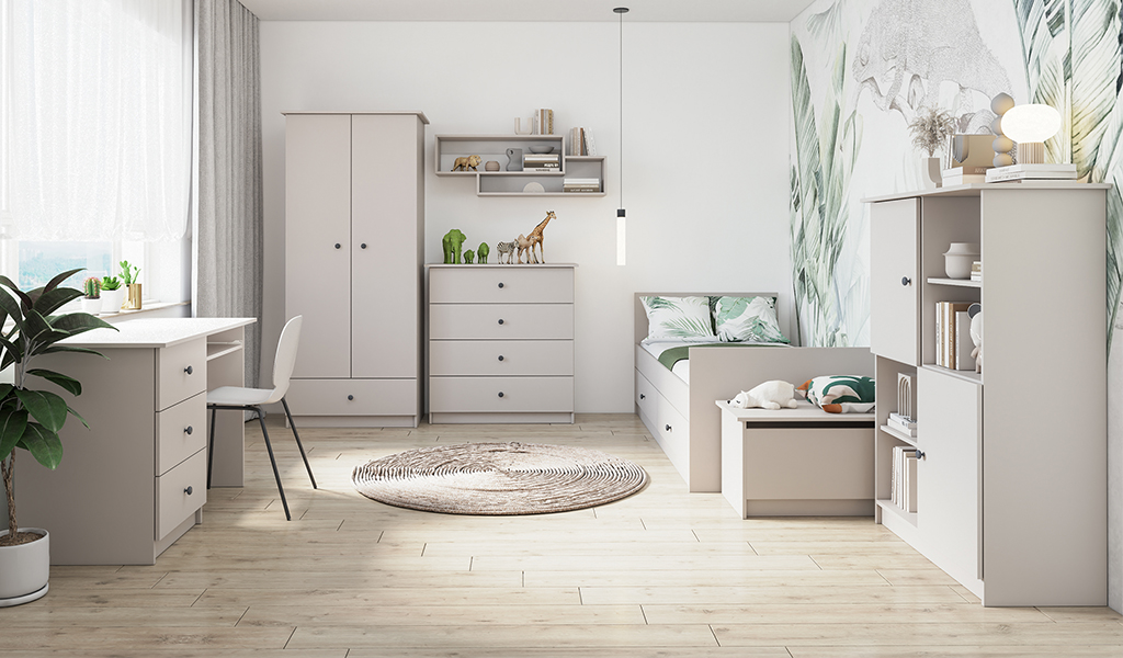 Az OLAFI gyerekszoba bútor garnitúra modern és praktikus megoldást kínál a gyerekszobába vagy az ifjúsági szobába. Tervezésekor az egyszerűség, a funkcionalitás és a letisztult megjelenés került előtérbe, így könnyedén illeszkedik bármilyen otthonba. A bútorok két színváltozatban érhetők el: fehér és kasmír kivitelben. A fogantyúk színét pedig saját maga választhatja ki, attól függően, hogy lányos vagy fiús gyerekszobába választja-e, lehet rózsaszín vagy antracit. A kollekció egyes elemei kiváló minőségű 16 mm vastag laminált bútorlapból készülnek, tartós ABS élzárással. Az OLAFI bútorcsalád nagy szabadságot ad az összeállításban, az egyes bútordarabok szabadon kombinálhatók, így könnyedén kialakíthatja a tökéletes gyermekszobát gyermeke számára.