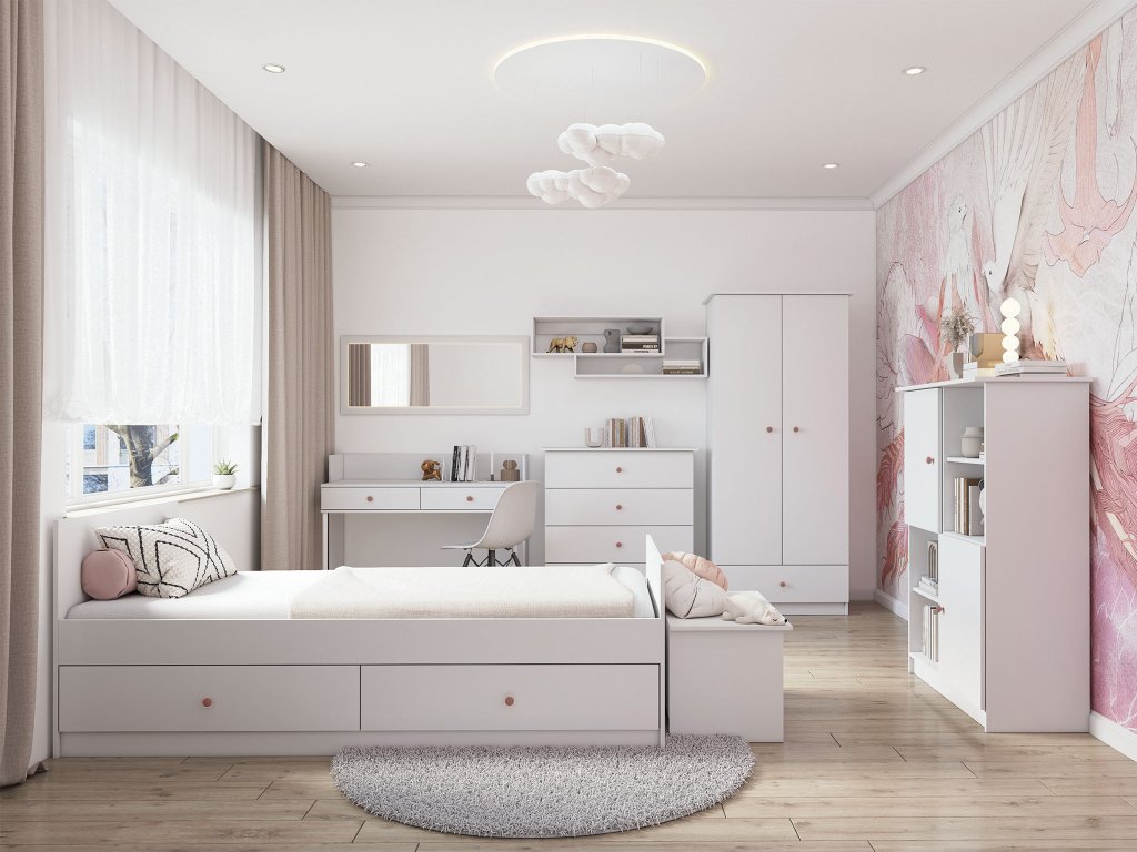 Az OLAFI gyerekszoba bútor garnitúra modern és praktikus megoldást kínál a gyerekszobába vagy az ifjúsági szobába. Tervezésekor az egyszerűség, a funkcionalitás és a letisztult megjelenés került előtérbe, így könnyedén illeszkedik bármilyen otthonba. A bútorok két színváltozatban érhetők el: fehér és kasmír kivitelben. A fém fogantyúk színét pedig saját maga választhatja ki, attól függően, hogy lányos vagy fiús gyerekszobába választja-e, lehet rózsaszín vagy antracit. A kollekció egyes elemei kiváló minőségű 16 mm vastag laminált bútorlapból készülnek, tartós ABS élzárással. Az OLAFI bútorcsalád nagy szabadságot ad az összeállításban, az egyes bútordarabok szabadon kombinálhatók, így könnyedén kialakíthatja a tökéletes gyermekszobát gyermeke számára.