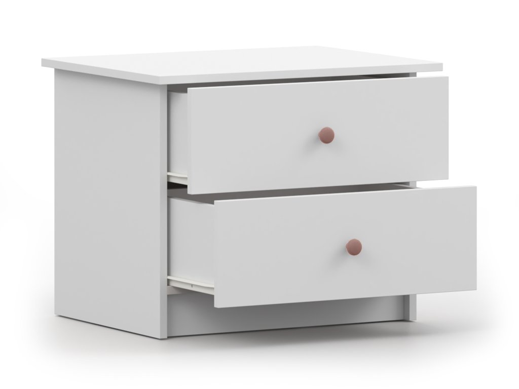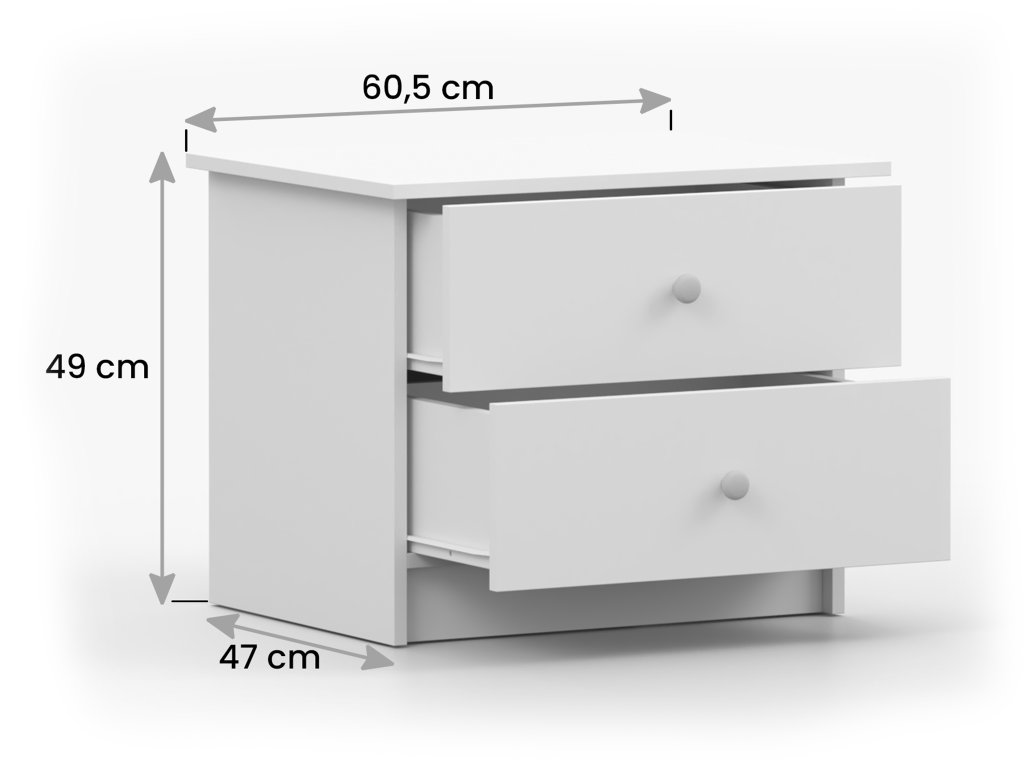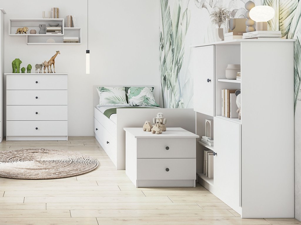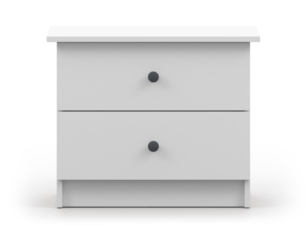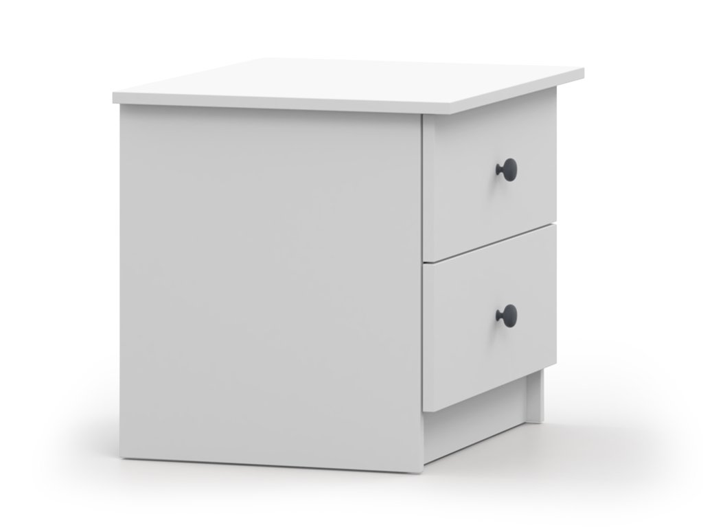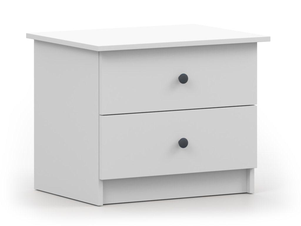 Az OLAFI éjjeliszekrény fehér színben praktikus és stílusos kiegészítő, amely kompakt méretének köszönhetően kisebb szobákban is könnyedén elfér. Két tágas fiókja elegendő helyet kínál mindazoknak az apróságoknak, amelyek jó, ha kéznél vannak. Letisztult formája modern megjelenést ad neki, így gyerekszobába, kamaszok szobájába vagy a hálószobába egyaránt remek választás.