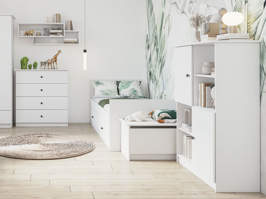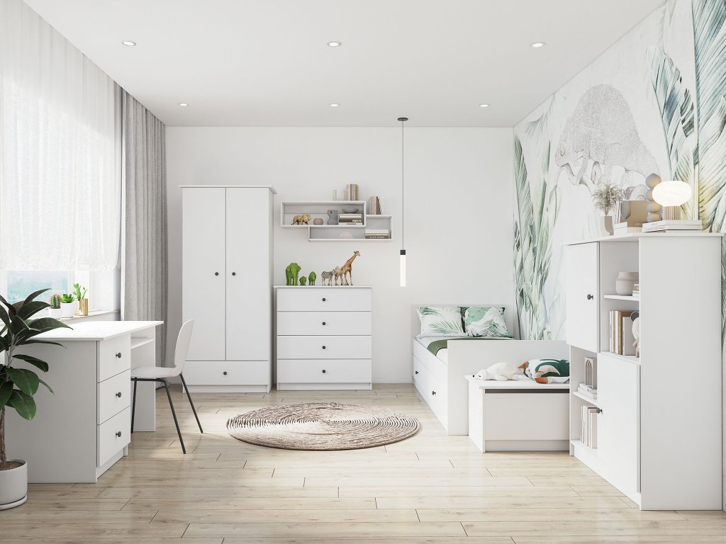 Az OLAFI gyerekszoba bútor garnitúra modern és praktikus megoldást kínál a gyerekszobába vagy az ifjúsági szobába. Tervezésekor az egyszerűség, a funkcionalitás és a letisztult megjelenés került előtérbe, így könnyedén illeszkedik bármilyen otthonba. A bútorok két színváltozatban érhetők el: fehér és kasmír kivitelben. A fém fogantyúk színét pedig saját maga választhatja ki, attól függően, hogy lányos vagy fiús gyerekszobába választja-e, lehet rózsaszín vagy antracit. A kollekció egyes elemei kiváló minőségű 16 mm vastag laminált bútorlapból készülnek, tartós ABS élzárással. Az OLAFI bútorcsalád nagy szabadságot ad az összeállításban, az egyes bútordarabok szabadon kombinálhatók, így könnyedén kialakíthatja a tökéletes gyermekszobát gyermeke számára.