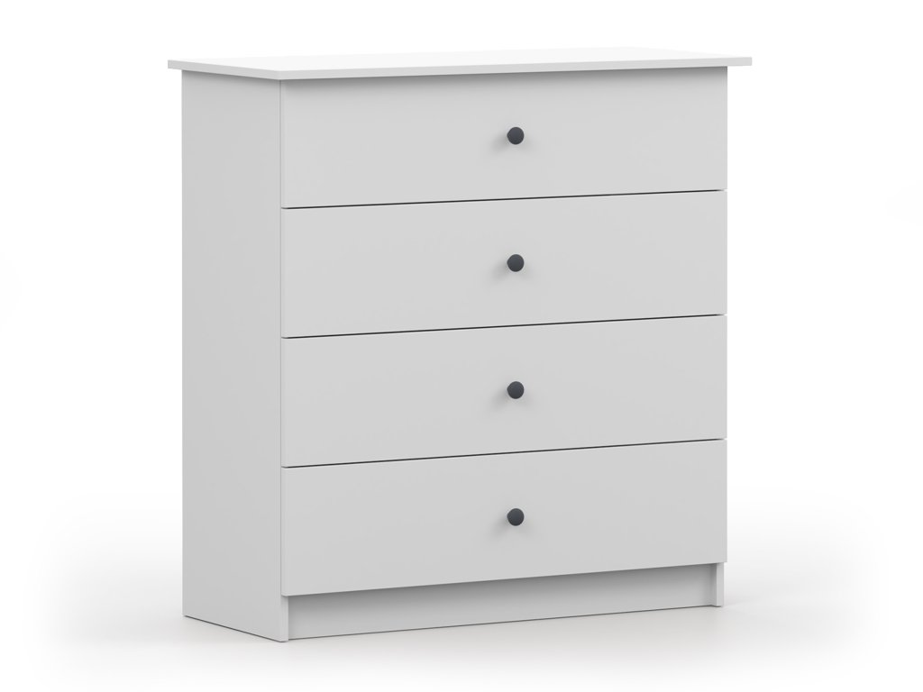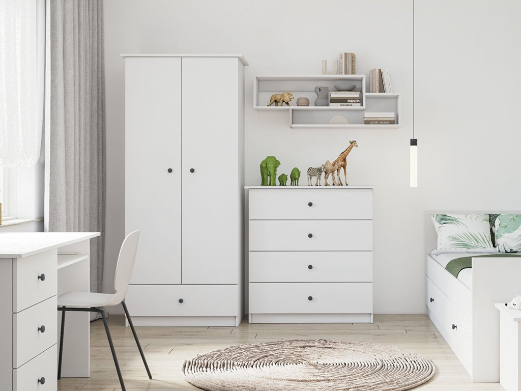A fehér színben készült letisztult és minimalista stílusú Olafi gyerekszoba komód praktikus és stílusos kiegészítője lehet a gyerekszobának vagy a kamaszok szobájának. Négy tágas fiókja bőséges helyet kínál a ruháknak, kiegészítőknek vagy iskolai eszközöknek, így segít könnyedén rendet tartani. Letisztult formája és modern részletei gondoskodnak róla, hogy bármilyen szobában harmonikusan illeszkedjen, miközben egyszerre funkcionális és esztétikus megoldást nyújt a mindennapokra.