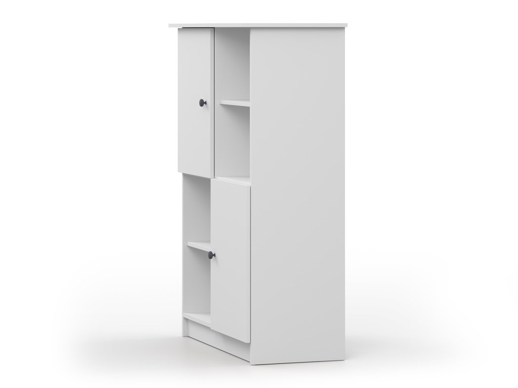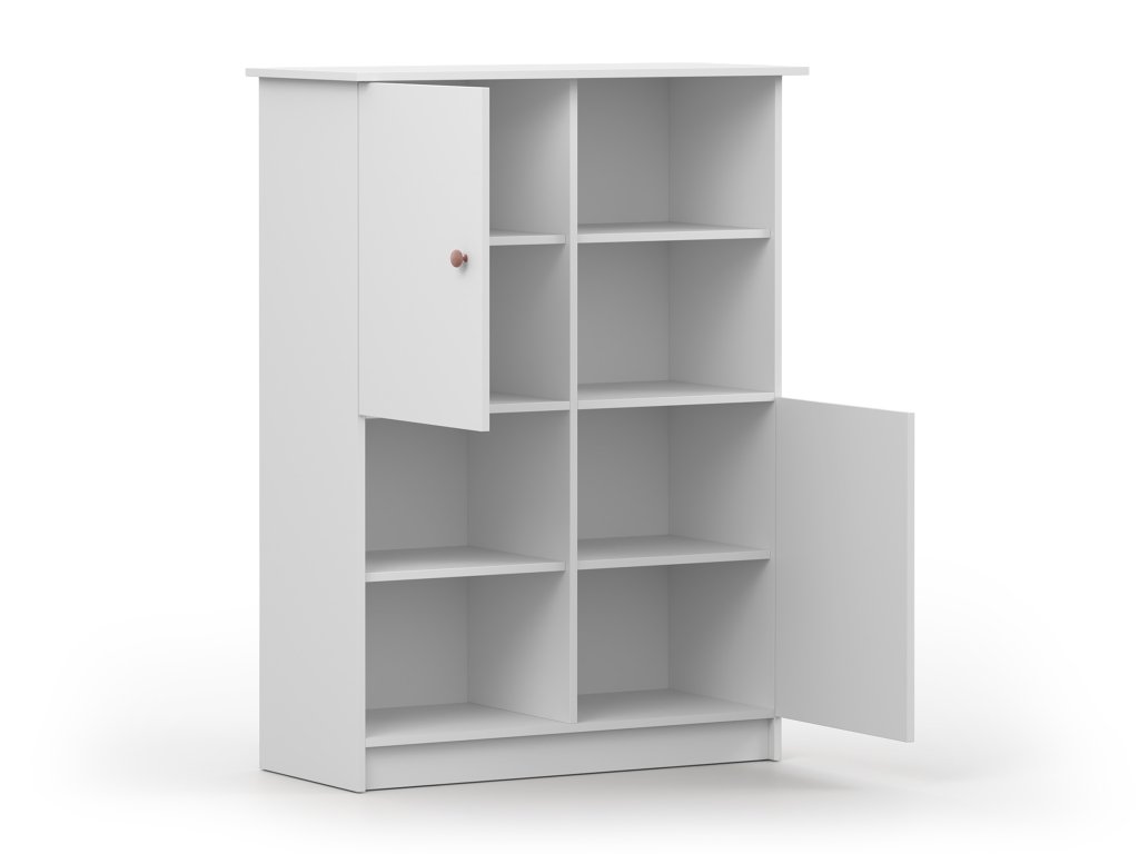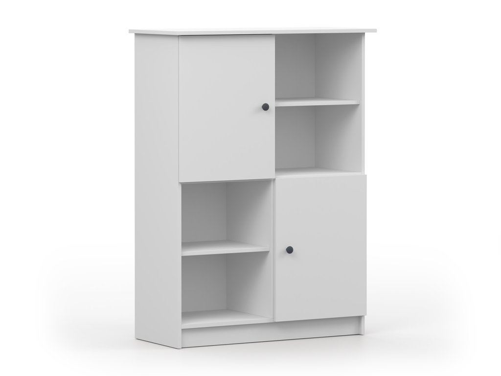 A gyönyörű és minimalista stílusú fehér OLAFI könyvespolc praktikus kiegészítő a gyerekszobába vagy ifjúsági szobába. A polcos szekrény nyitott polcokat tartalmaz a könyveknek, dísztárgyaknak vagy az iskolai eszközöknek. A két ajtós kis szekrénybe pedig elhelyezhet mindent, amit nem szeretne szem előtt tartani.
