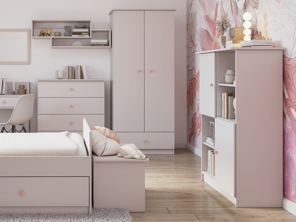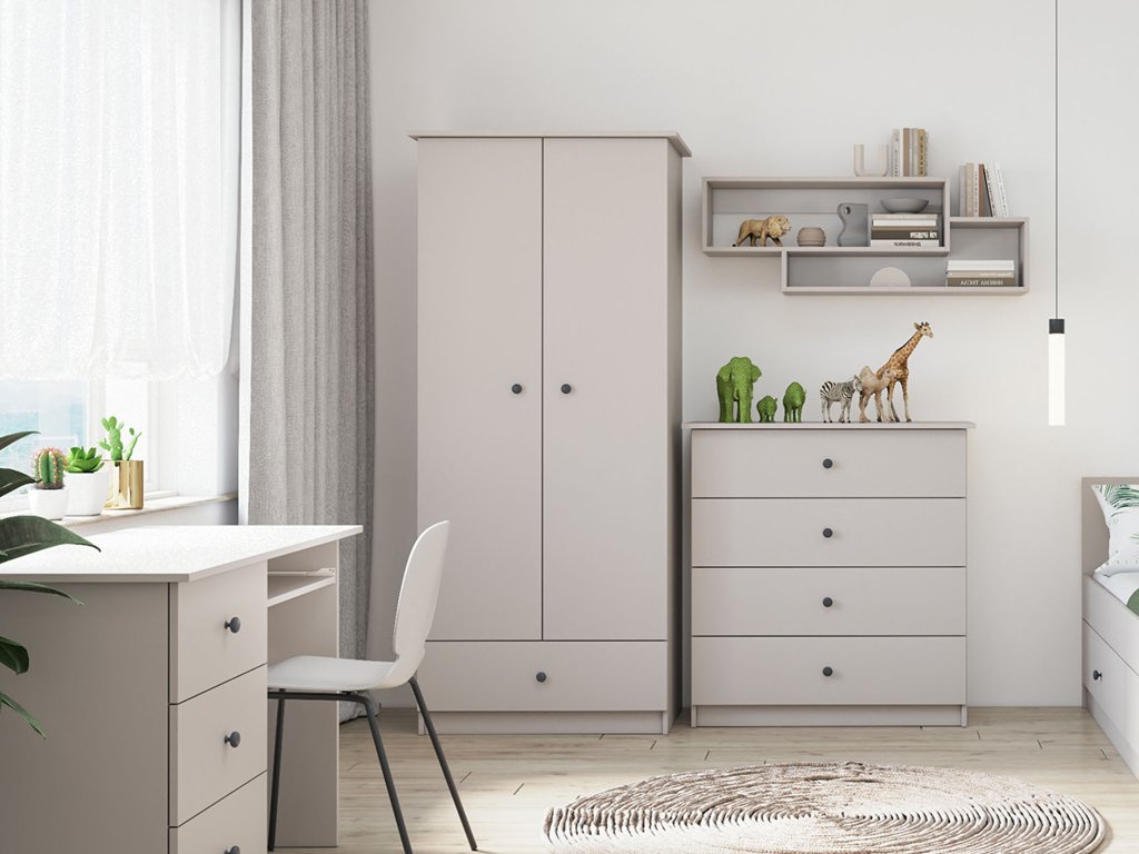 Az OLAFI 2D kétajtós ruhásszekrény kasmír színben tökéletes egyensúlyt teremt a stílus és a praktikum között. Tágas belső elrendezése polcokkal, akasztórúddal és egy praktikus fiókkal gondoskodik arról, hogy a gyerekek ruhái és a szezonális darabok is rendezetten elférjenek. A hagyományos nyíló ajtóknak köszönhetően könnyen átlátható a szekrény belseje. A lágy kasmír szín modern és otthonos hangulatot teremt, így a szekrény a gyerekszobába, de kamaszok szobájába is ideális választás.