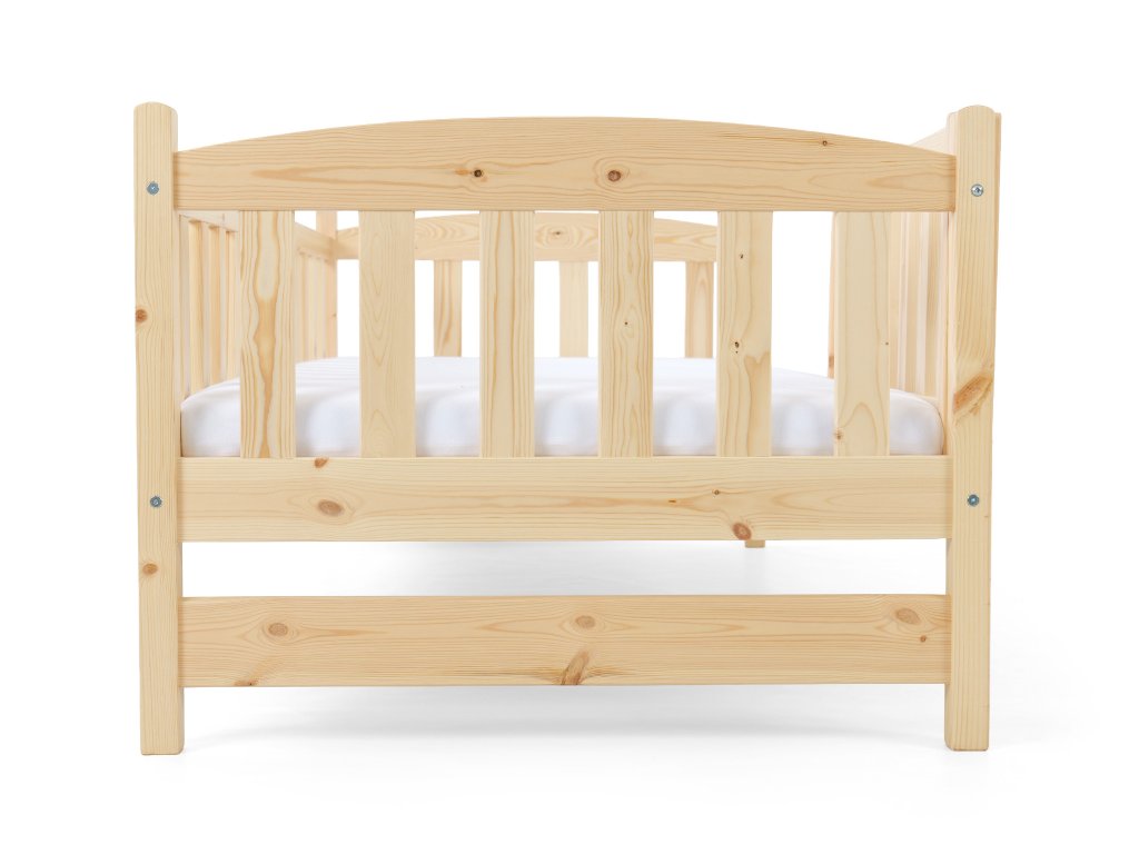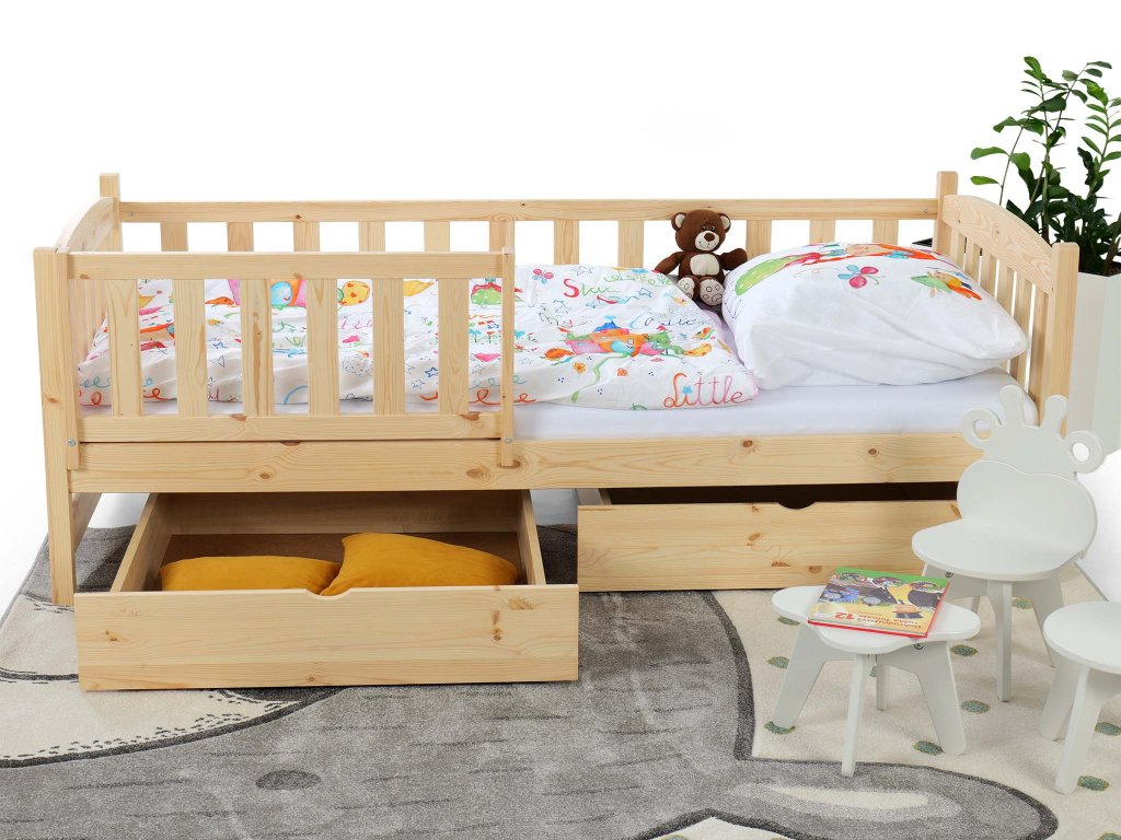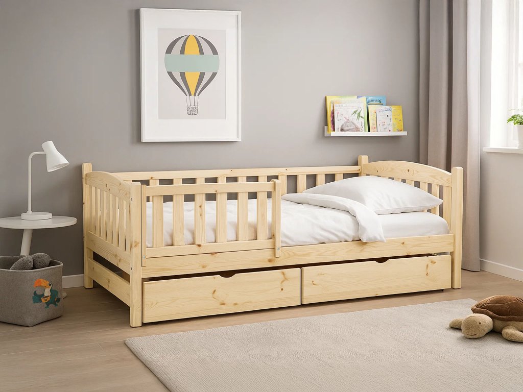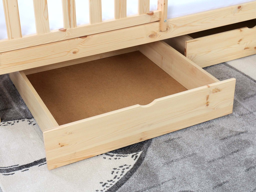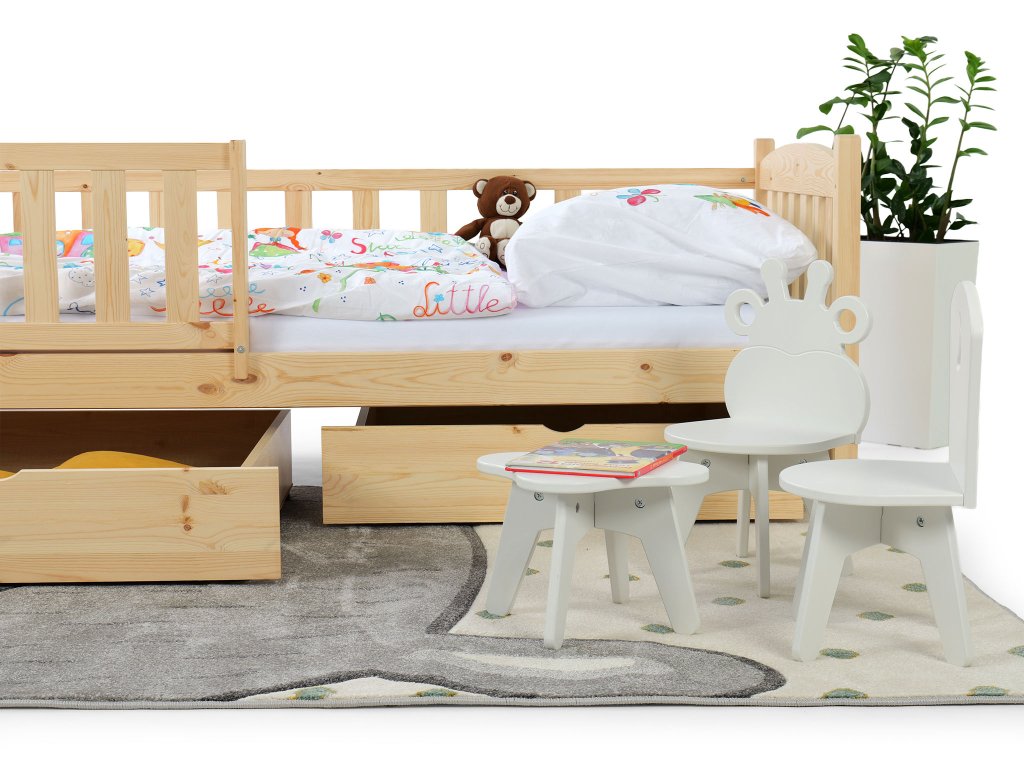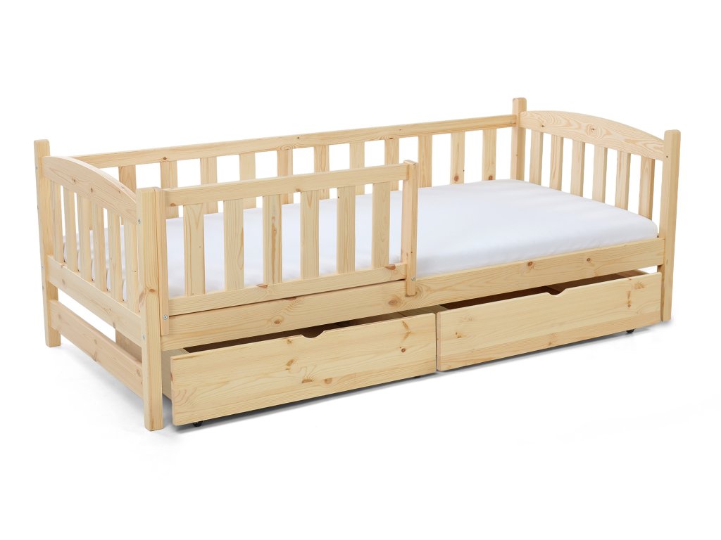 Az OLGA 2 ágy minőségi tömör boroviból készült. Az ágy natúr kivitelben kapható, természetre nem ártalmas ökológiai lakkal kezelve. A felhasznált anyagoknak köszönhetően az ágy magas minőségű és nagyon stabil. Az ágy ágyráccsal és tároló fiókkal együtt kapható.Az ágy 2 ágyneműtartó fiókot tartalmaz, amelyek műanyag kerekeken mozognak, hogy ne okozzanak sérülést a padlón és nincsenek az ágyhoz rögzítve. Az ágyhoz tartozik leesésgátló is, amely biztosítja gyermeke biztonságát. A leesésgátló leszerelhető, amennyiben gyermekének már nincs rá szüksége, könnyedén leveheti. A leesésgátló az ágy mindkét oldalára felszerelhető.