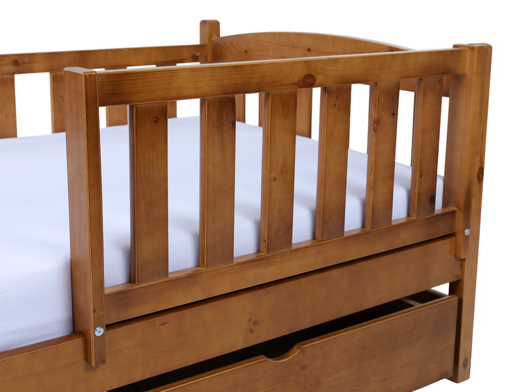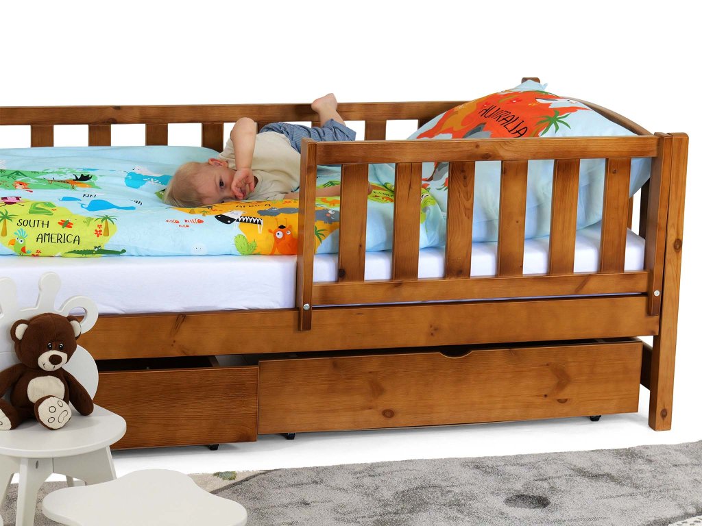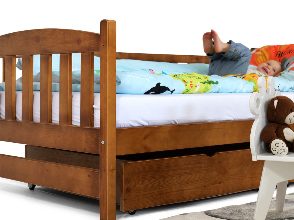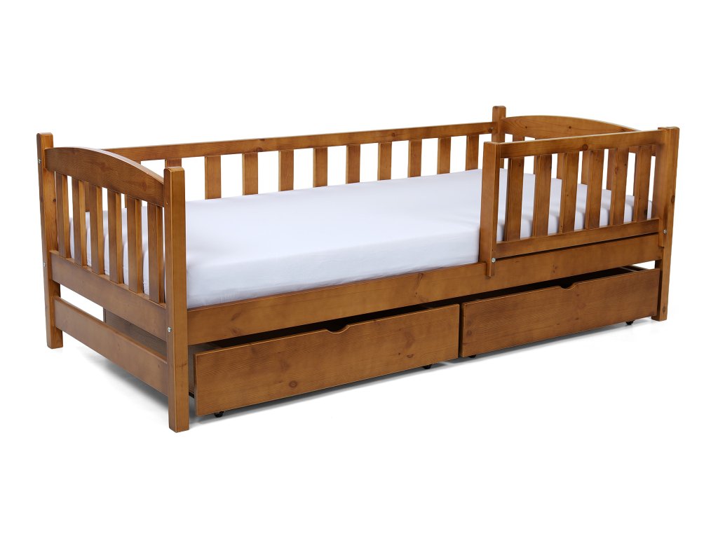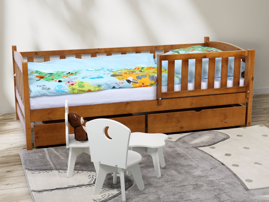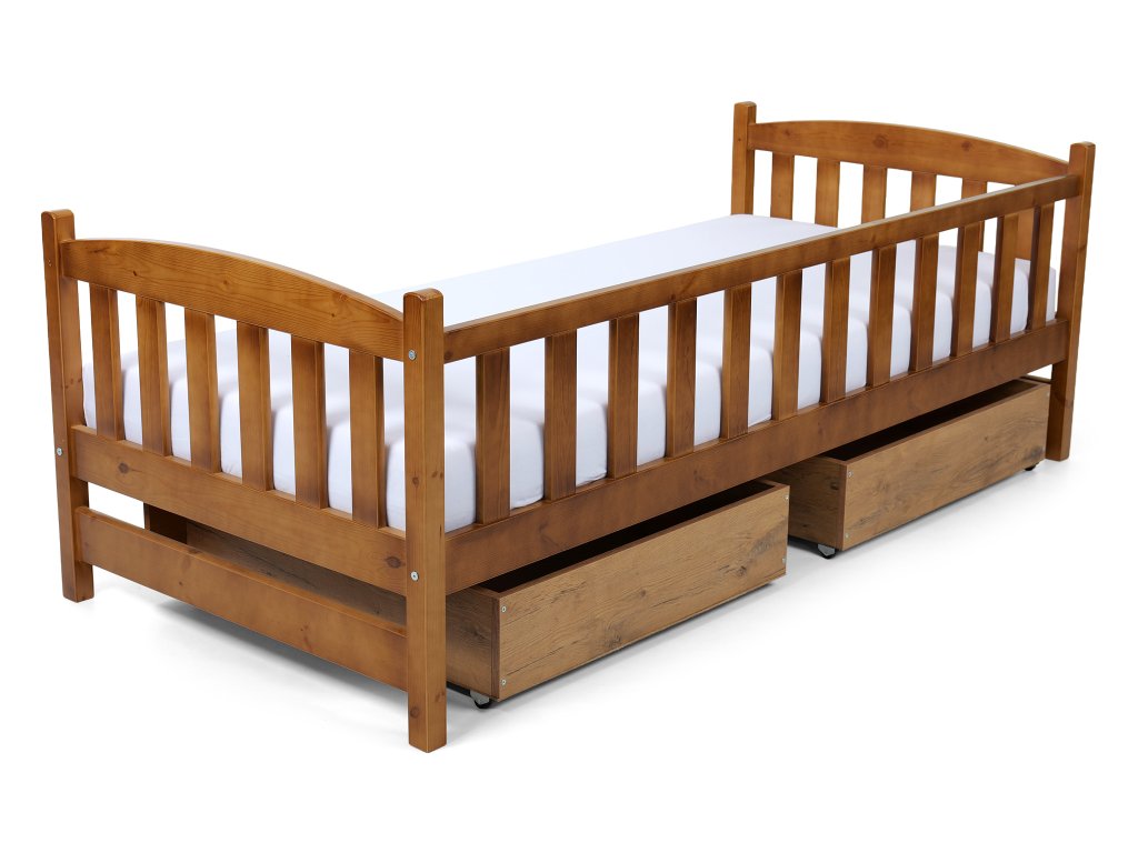 Az OLGA 2 ágy minőségi tömör boroviból készült. Az ágy tölgy kivitelben kapható, természetre nem ártalmas ökológiai lakkal kezelve. A felhasznált anyagoknak köszönhetően az ágy magas minőségű és nagyon stabil. Az ágy ágyráccsal és tároló fiókkal együtt kapható.Az ágy 2 ágyneműtartó fiókot tartalmaz, amelyek műanyag kerekeken mozognak, hogy ne okozzanak sérülést a padlón és nincsenek az ágyhoz rögzítve. Az ágyhoz tartozik leesésgátló is, amely biztosítja gyermeke biztonságát. A leesésgátló leszerelhető, amennyiben gyermekének már nincs rá szüksége, könnyedén leveheti. A leesésgátló az ágy mindkét oldalára felszerelhető.