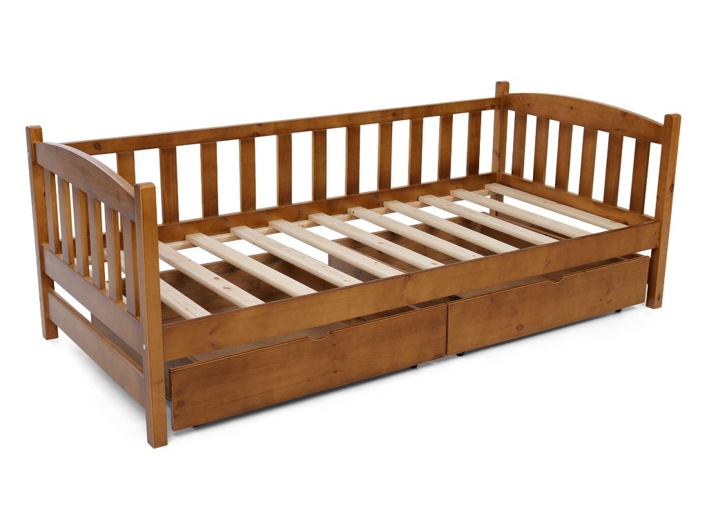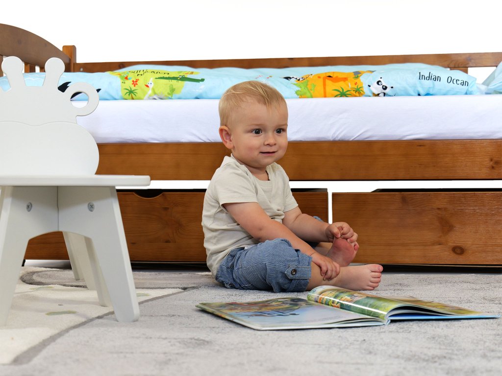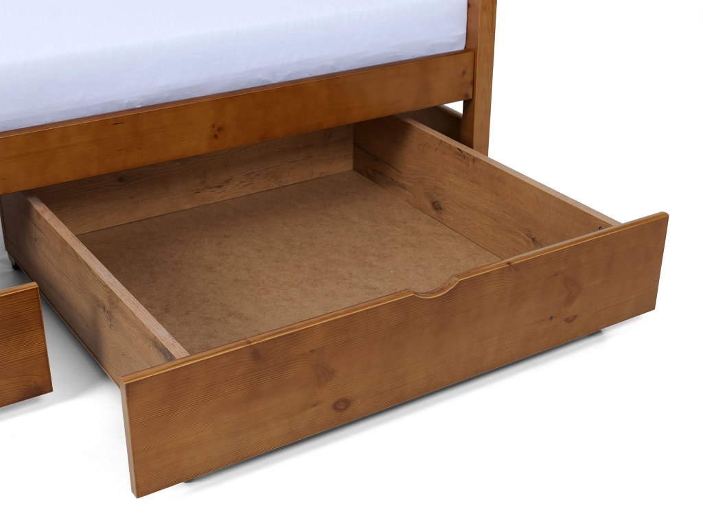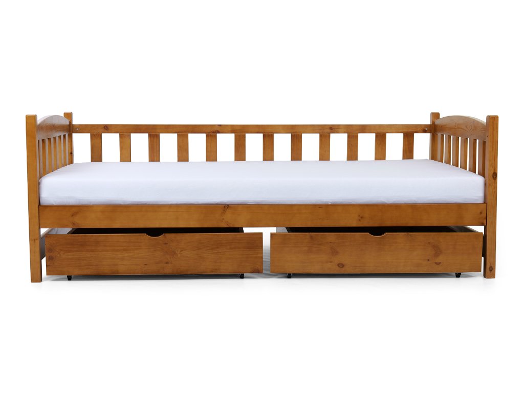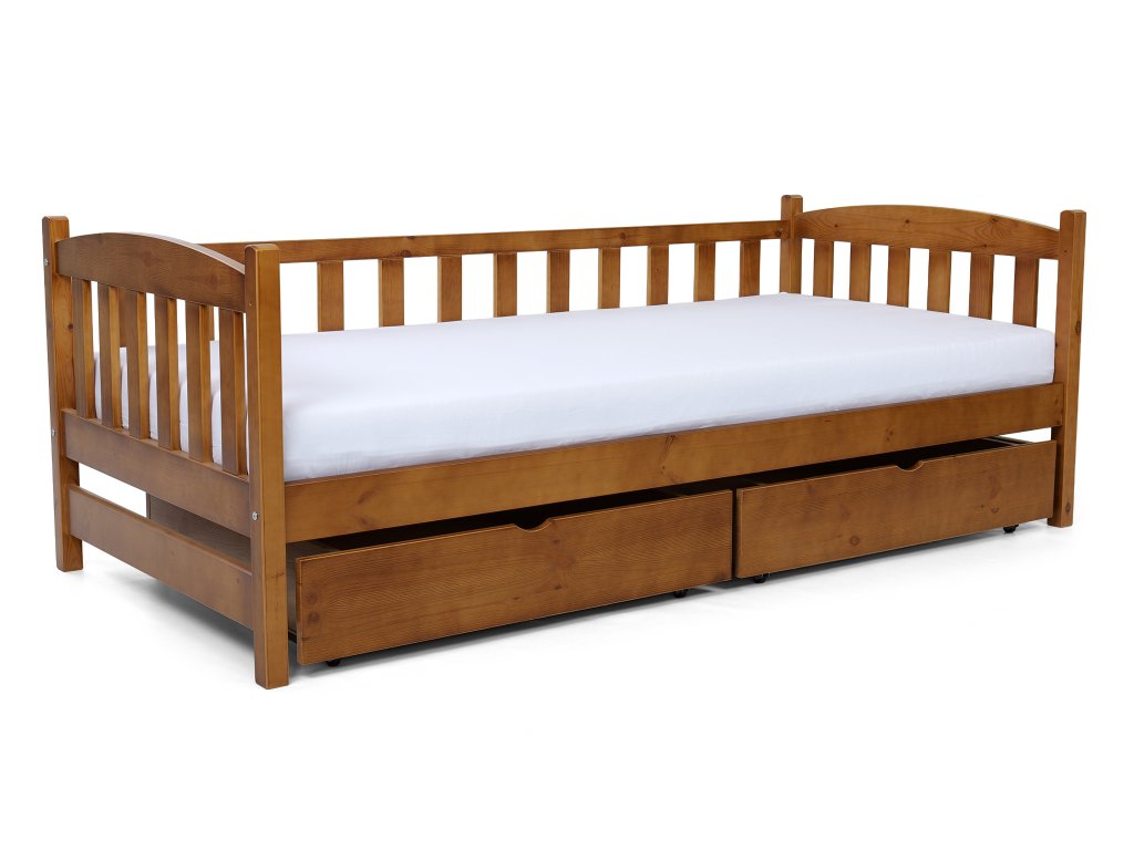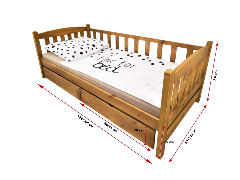 Az OLGA 2 ágy minőségi tömör boroviból készült. Az ágy tölgy kivitelben kapható, természetre nem ártalmas ökológiai lakkal kezelve. A felhasznált anyagoknak köszönhetően az ágy magas minőségű és nagyon stabil. Az ágy ágyráccsal és tároló fiókkal együtt kapható.Az ágy 2 ágyneműtartó fiókot tartalmaz, amelyek műanyag kerekeken mozognak, hogy ne okozzanak sérülést a padlón és nincsenek az ágyhoz rögzítve. Az ágyhoz tartozik leesésgátló is, amely biztosítja gyermeke biztonságát. A leesésgátló leszerelhető, amennyiben gyermekének már nincs rá szüksége, könnyedén leveheti. A leesésgátló az ágy mindkét oldalára felszerelhető.