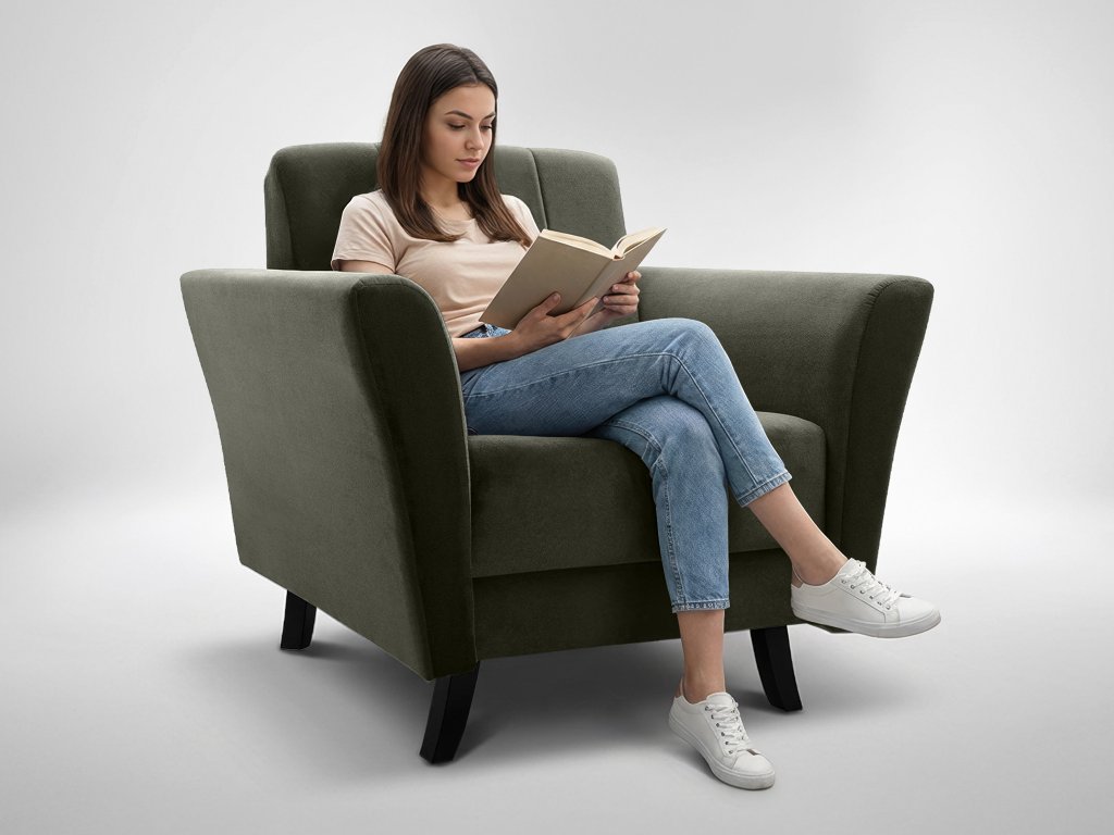 A fotel minőségi Kronos 46 olívazöld velúr szövettel van kárpitozva. 100% poliészterből készült és a velúr textíliák közé tartozik. A szövött kárpitanyag nagyon puha és kellemes tapintású. Ellenáll a fénynek, a kifakulásnak és nem bolyhosodik.