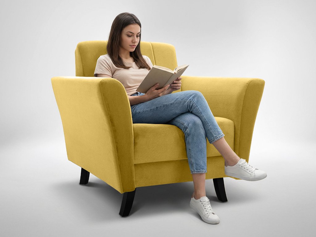 A fotel minőségi Kronos 43 sárga velúr szövettel van kárpitozva. Ez az anyag 100% poliészterből készült, és a velúr textíliák közé tartozik. A szövött kárpitanyag nagyon puha és kellemes tapintású, emellett ellenáll a fénynek, kifakulásnak és nem bolyhosodik.