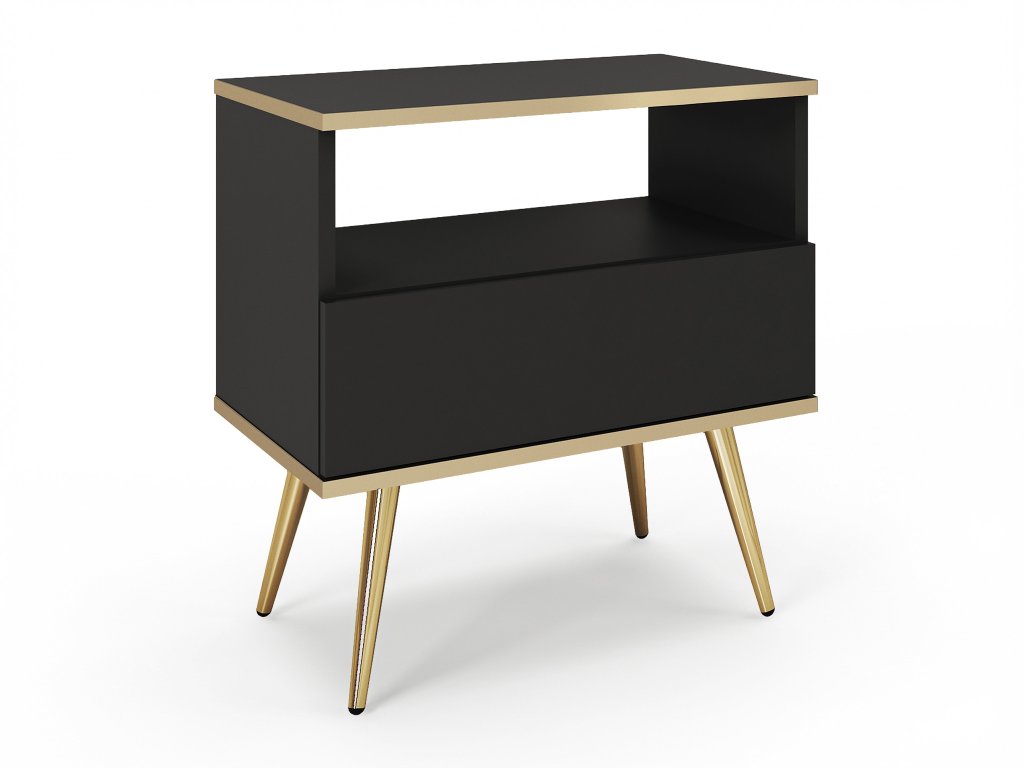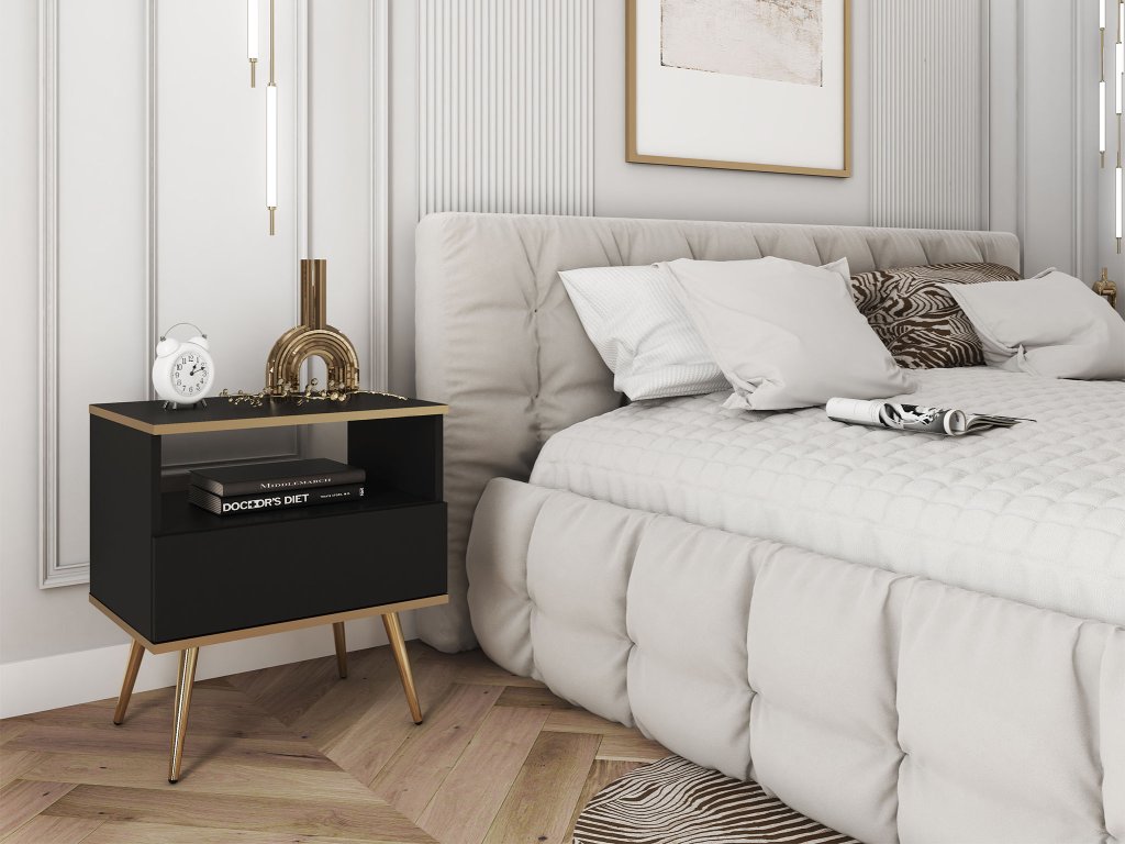 Az elegáns fekete színben készült ORIQUE éjjeliszekrény tökéletes választás minden elegáns hálószobába. A karcsú arany színű fém lábak azonnal magukra vonják a tekintetet, miközben a fekete felületek elegáns hatást keltenek. Ennek köszönhetően a szekrény tökéletesen illik a modern, glamour és minimalista otthonokba egyaránt. A fiók push-to-open rendszerrel működik, így egy finom érintéssel nyitható, fogantyúk nélkül, ami letisztult, prémium megjelenést biztosít. Praktikus tárolóhelyet kínál a mindennapi apróságok számára, miközben önmagában is elegáns dísze a hálószobának.