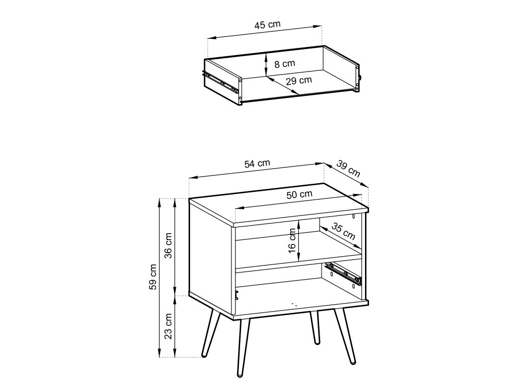 - Anyaga: laminált bútorlap, ABS furnér, fém lábak, golyós fióksínek