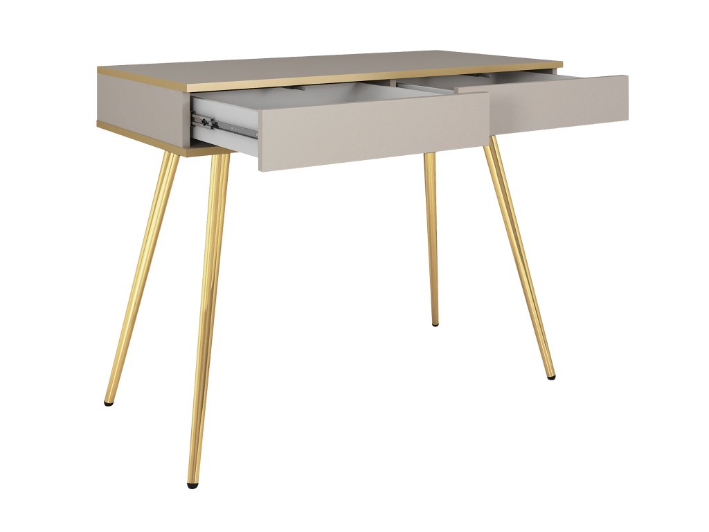 Az ORIQUE kasmír színű fésülködőasztal finom eleganciát és kifinomult stílust visz a modern otthonokba. A meleg kasmír szín, a sima felületek és az arany részletek harmonikus, luxusos összhatást keltenek. A sminkasztal légies és könnyed benyomást kelt a magas lábainak köszönhetően, ugyanakkor stabil szerkezettel rendelkezik, így a hálószoba praktikus és stílusos kiegészítője. A formát finoman keretező arany színű vonalak egyedi karaktert adnak neki, és igazán figyelemfelkeltő darabbá teszik. Az időtálló kasmír – arany színvilág tökéletesen illik a modern, glamour és a minimalista terekbe is, ahol a pipereasztal elegáns, mégis funkcionális dizájnelemként érvényesül.