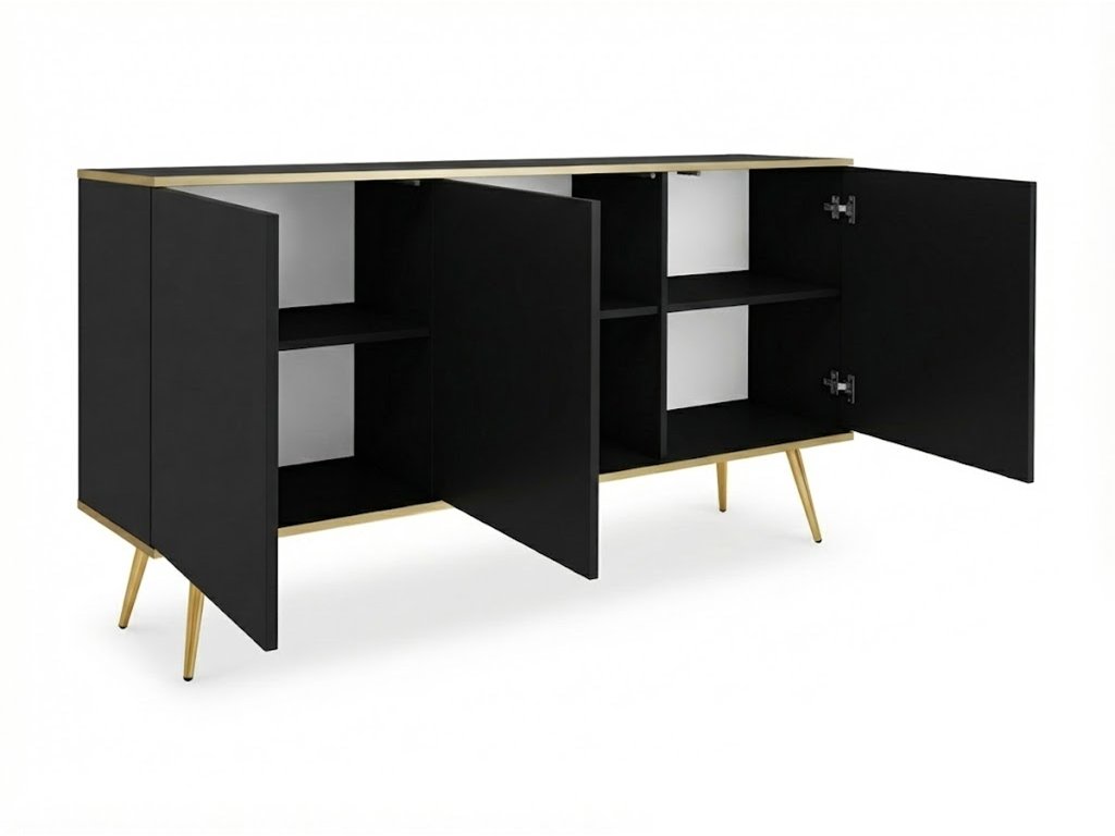 Az ORIQUE fekete háromajtós komód gyönyörű kialakításának és praktikus funkcióinak köszönhetően lenyűgöz mindenkit. A fogantyú nélküli sima fekete ajtók tökéletesen egységes megjelenést alkotnak, miközben az arany színű lábak és a komódot finoman körbefutó arany vonal elegáns hangsúlyt és visszafogott glamour stílust ad a bútornak. A polcokkal rendelkező átgondolt belső elrendezés bőséges tárolóhelyet kínál a ruhák, iratok vagy dekorációk számára, így a komód nemcsak a hálószobában, hanem a nappaliban vagy a dolgozószobában is remekül megállja a helyét. A légies megjelenés, a stabil szerkezet és az elegáns stílus együttese olyan bútordarabot eredményez, amely egyszerre praktikus és dekoratív.