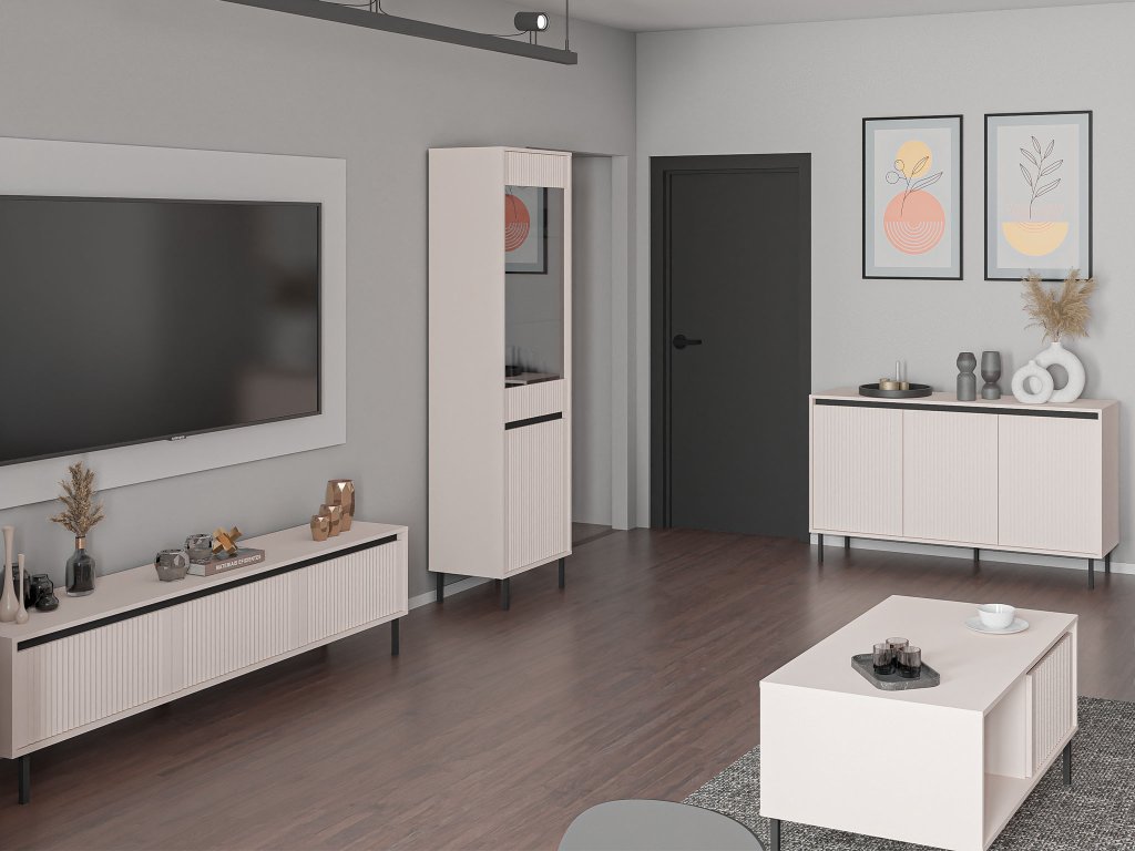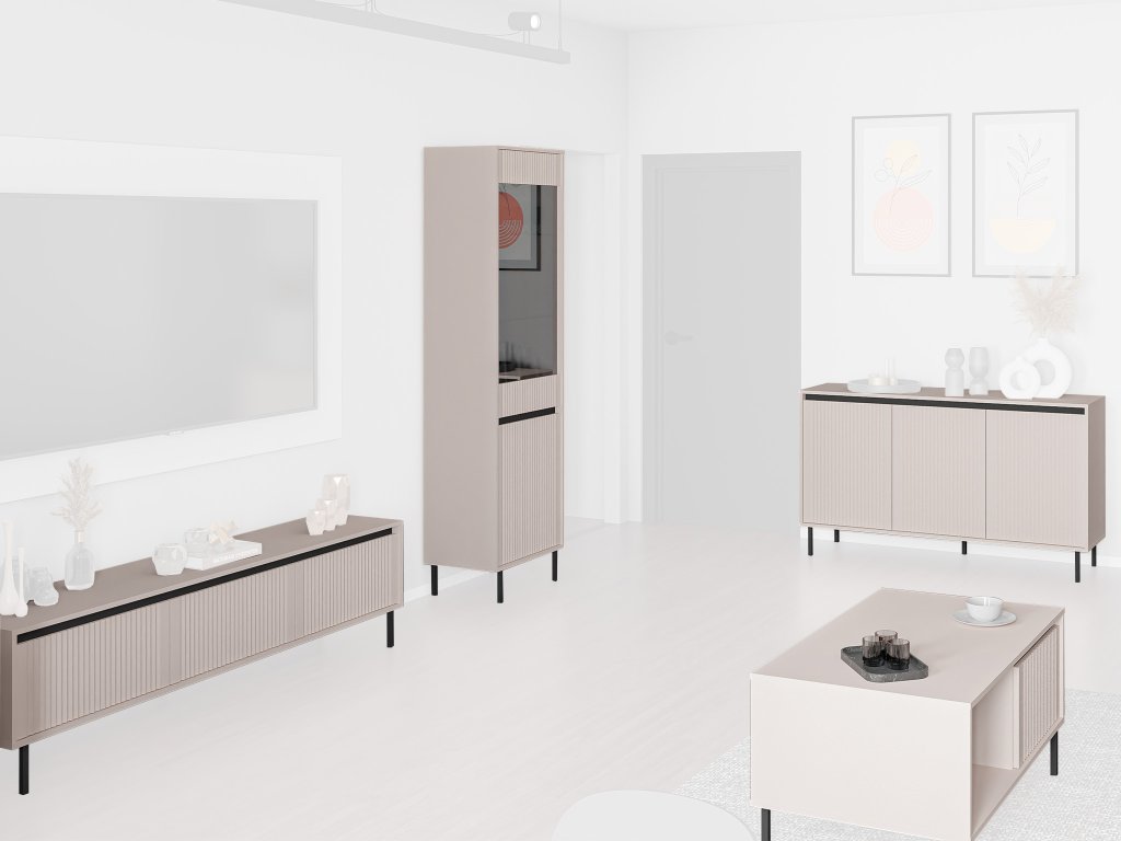 Az Osaka nappali kasmír színben három bútordarabból áll: Osaka 813 komód, Osaka 303 TV-állvány, Osaka 101 vitrin, Osaka 201 dohányzóasztal