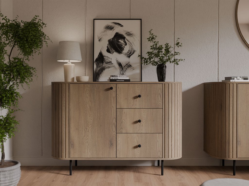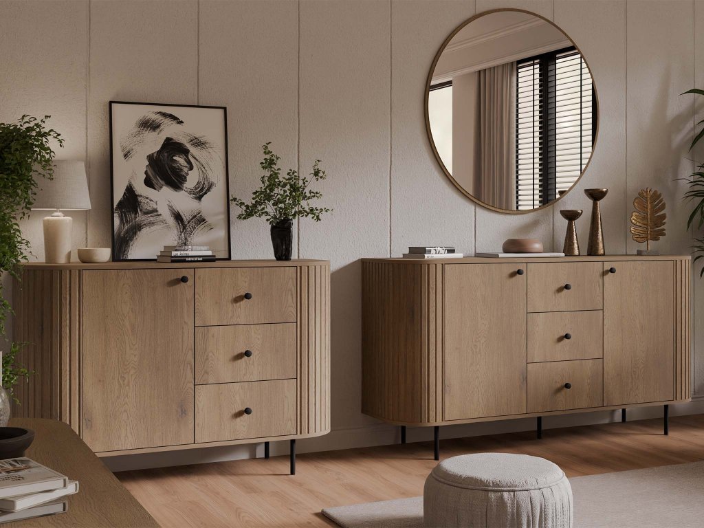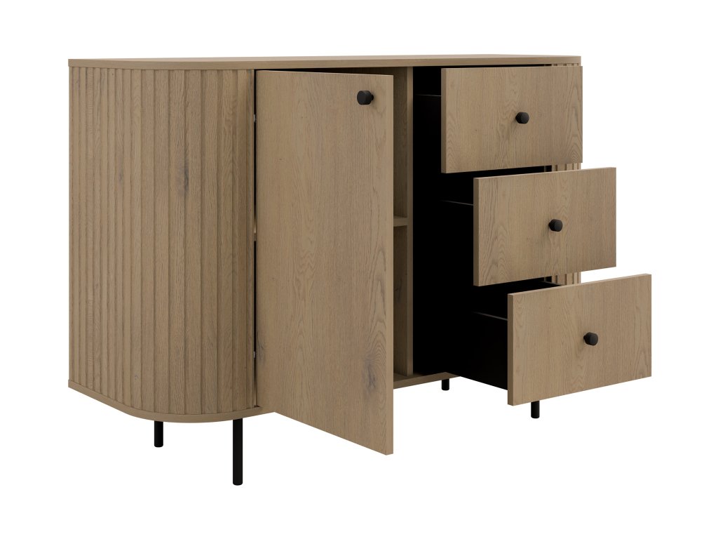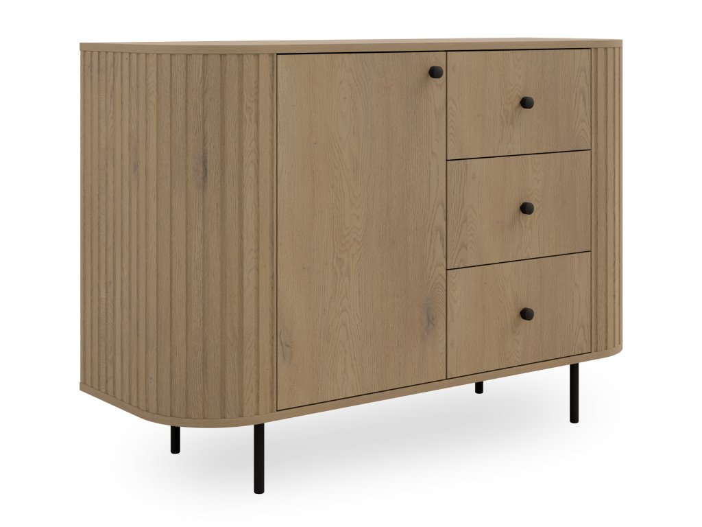 Kompakt komód Ovalio dekorációban cremona tölgy természetes meleget és harmonikus stílust hoz a belső térbe modern, lekerekített kivitelben. Fekete gombos fogantyúk és karcsú fém lábak könnyedséget és légies megjelenést kölcsönöznek a komódnak. Praktikus kombinációja egy ajtónak polccal és három tágas fióknak lehetővé teszi a ruhák, kiegészítők vagy háztartási cikkek áttekinthető tárolását. Időtlen megjelenésének köszönhetően a komód elegáns kiegészítője lesz a nappalinak, hálószobának vagy előszobának, és egyúttal kellemes dekoratív elemet hoz létre.