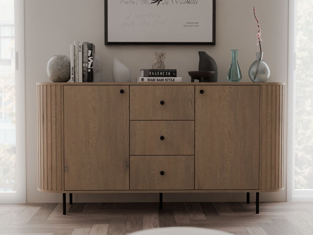 Természetes széles Ovalio komód Cremona tölgy dekorban vonzza a természetes, meleg megjelenésével, amely illik a modern, minimalista és skandináv enteriőrökbe. A felső lap helyet biztosít dekorációknak, lámpáknak vagy családi fotóknak, míg az ajtós rész polcokkal és három tágas fiók lehetővé teszi a ruhák vagy apró kiegészítők rendezett tárolását. A komódot karcsú fekete fém lábak és fogantyúk egészítik ki, amelyek elegáns, légies és kifinomult karaktert kölcsönöznek neki.